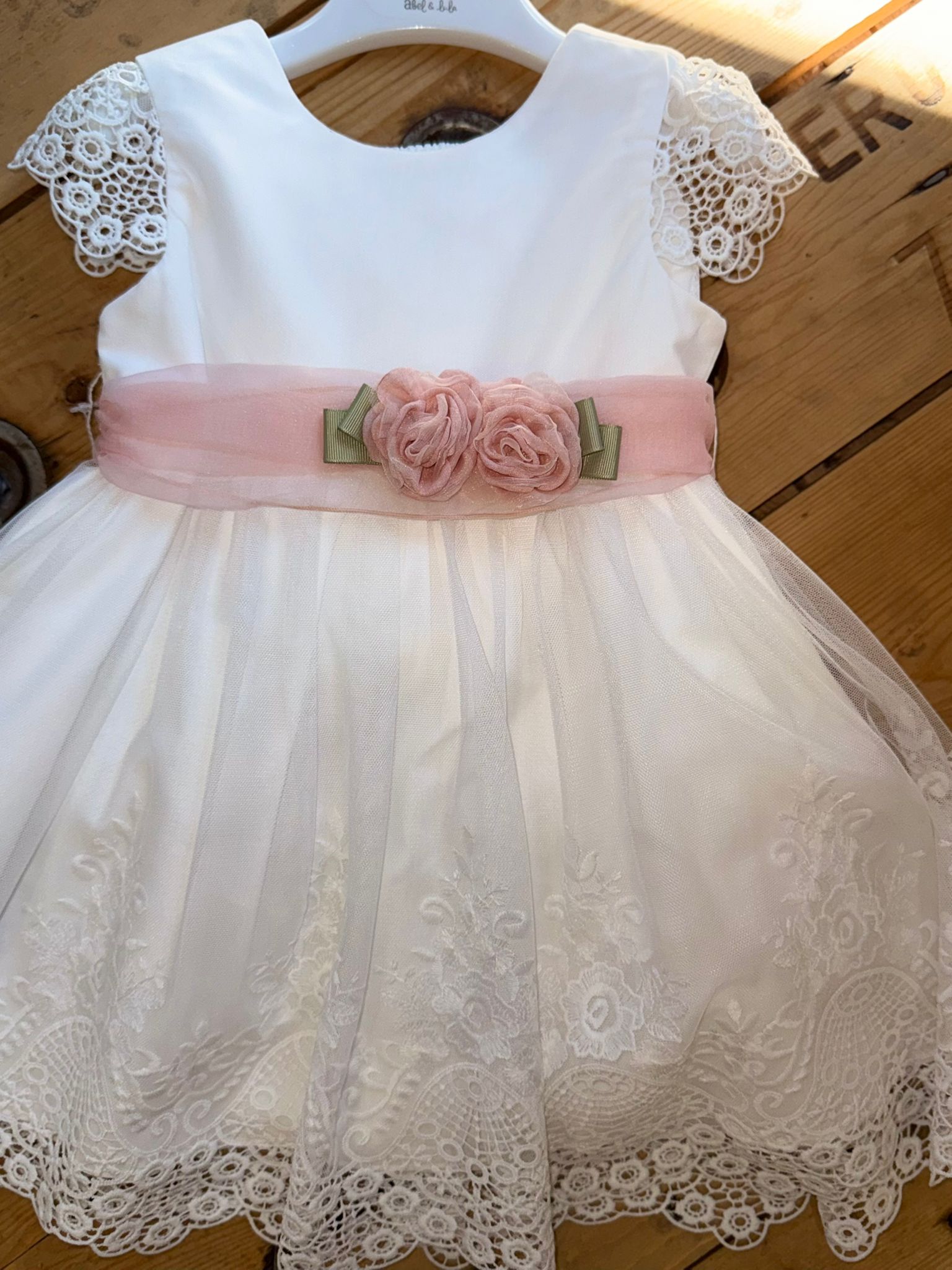 Delicatissimo abito firmato Abel & Lula in colore bianco con inserto in pizzo sulla manica e sul gonnellone. Cintira in vita in colore rosa impreziosita da applicazione floreale.
