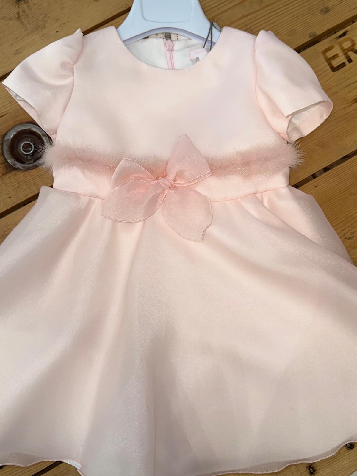 Delicato abito in organza color rosa. Mezza manica e corpetto impreziosito da nastro in pelliccia e fiocco tono su tono.