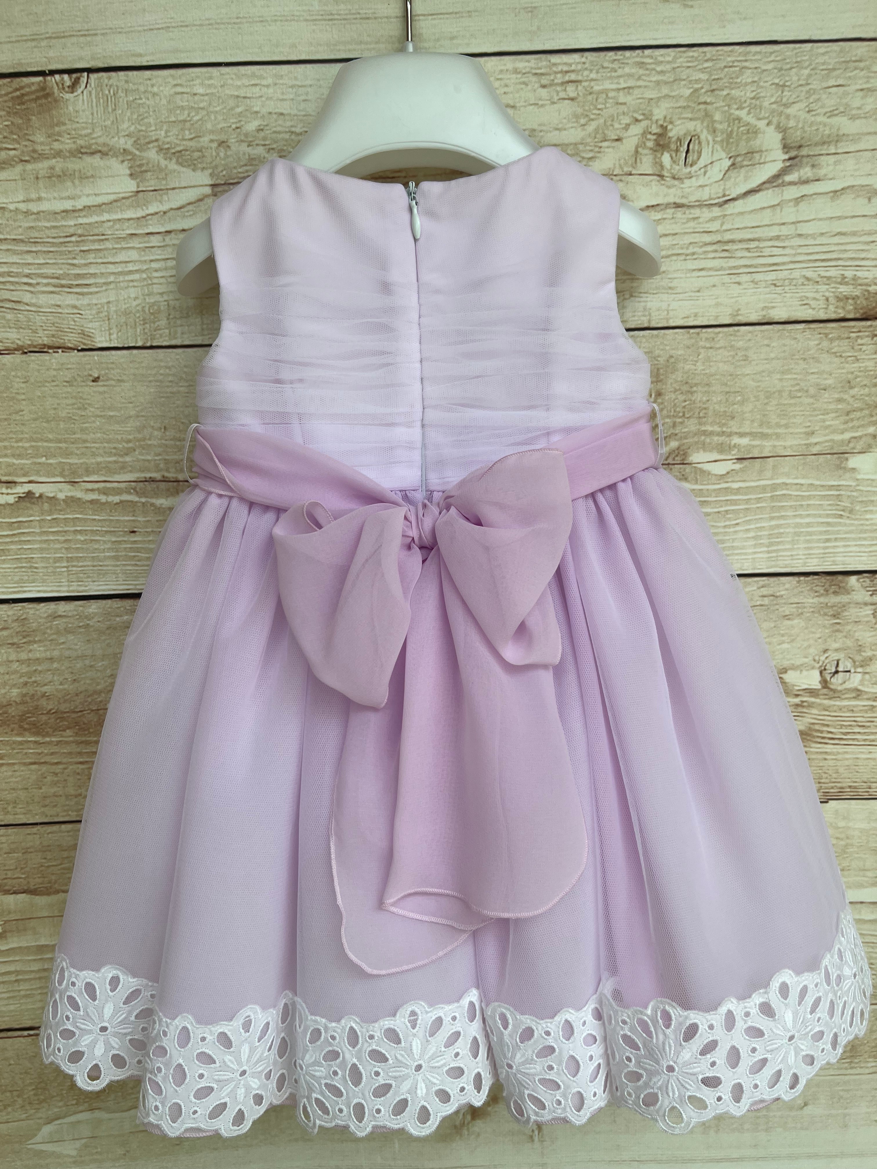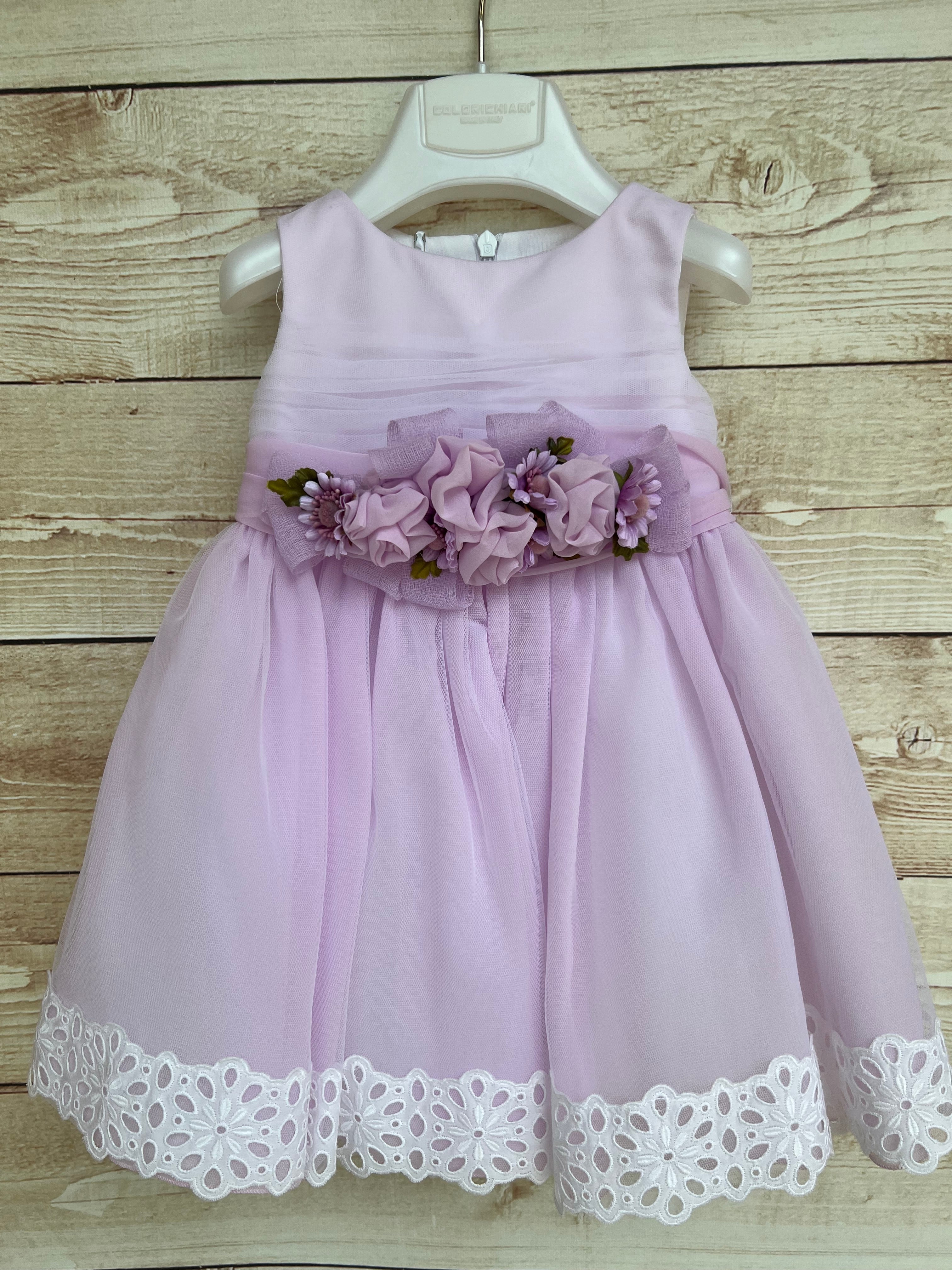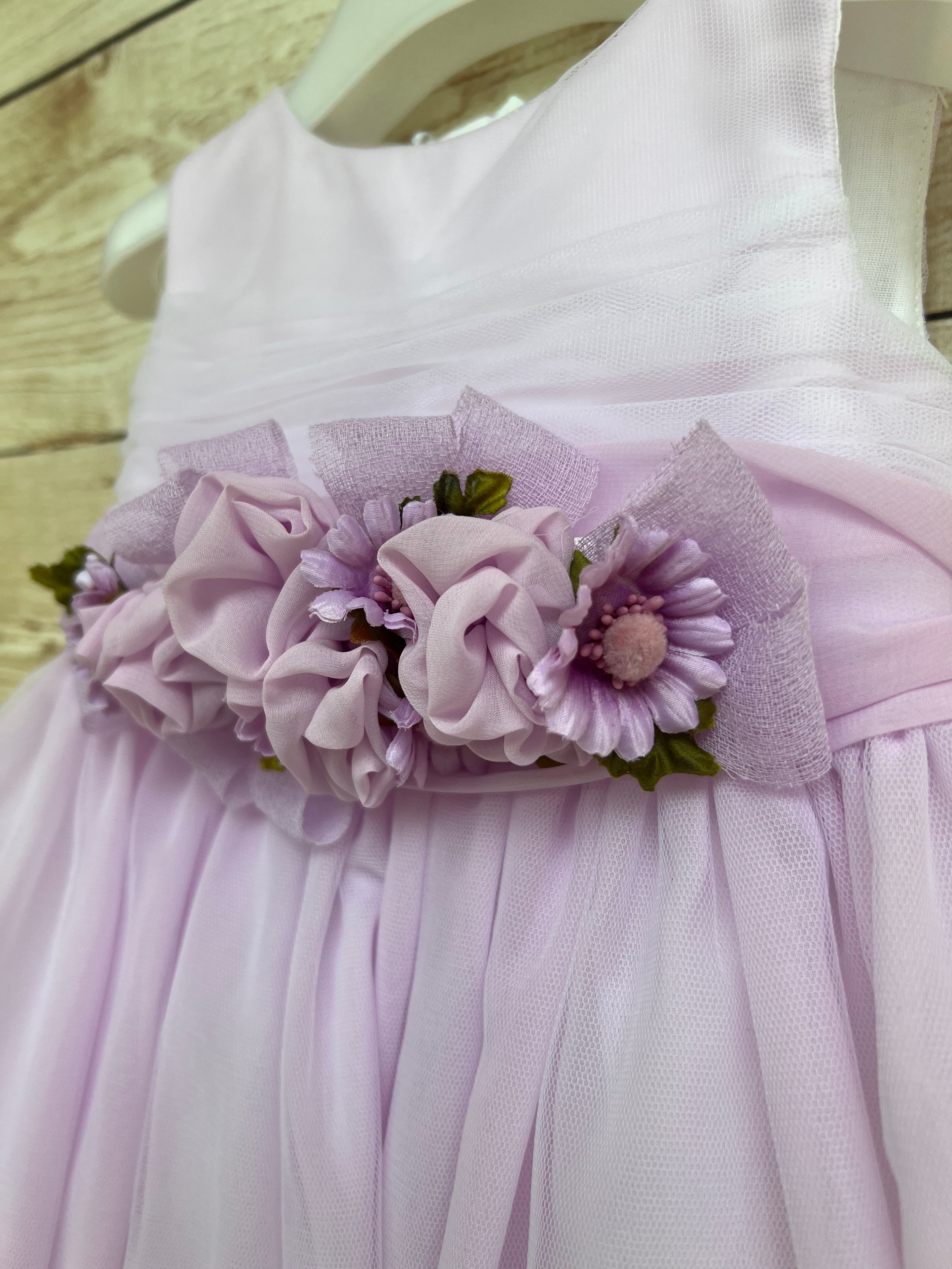 Raffinato abito da cerimonia firmato Colorichiari cod FN108048, in una delicata tonalità glicine. Il modello si distingue per il suo design romantico e curato nei dettagli: il gonnellone in tulle è impreziosito da un inserto in pizzo che ne valorizza la linea finale con un tocco di grazia senza tempo.