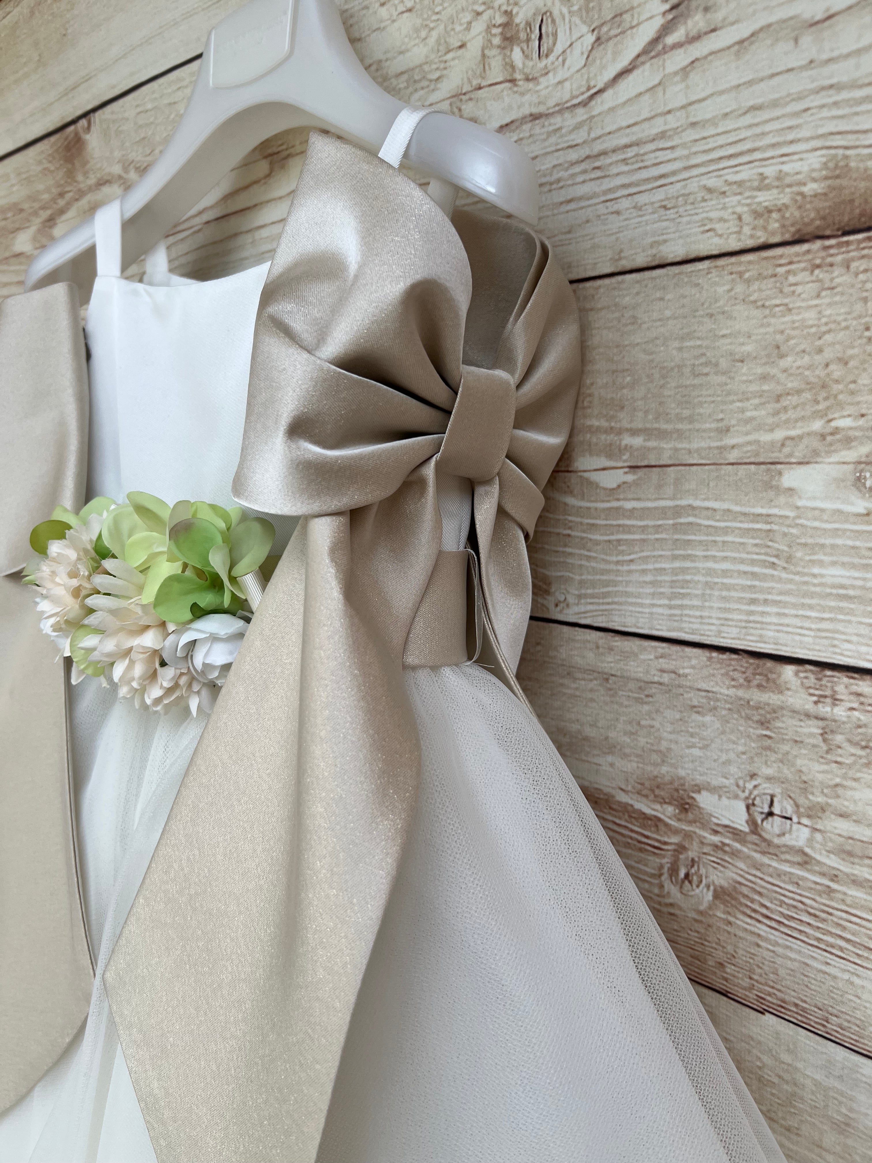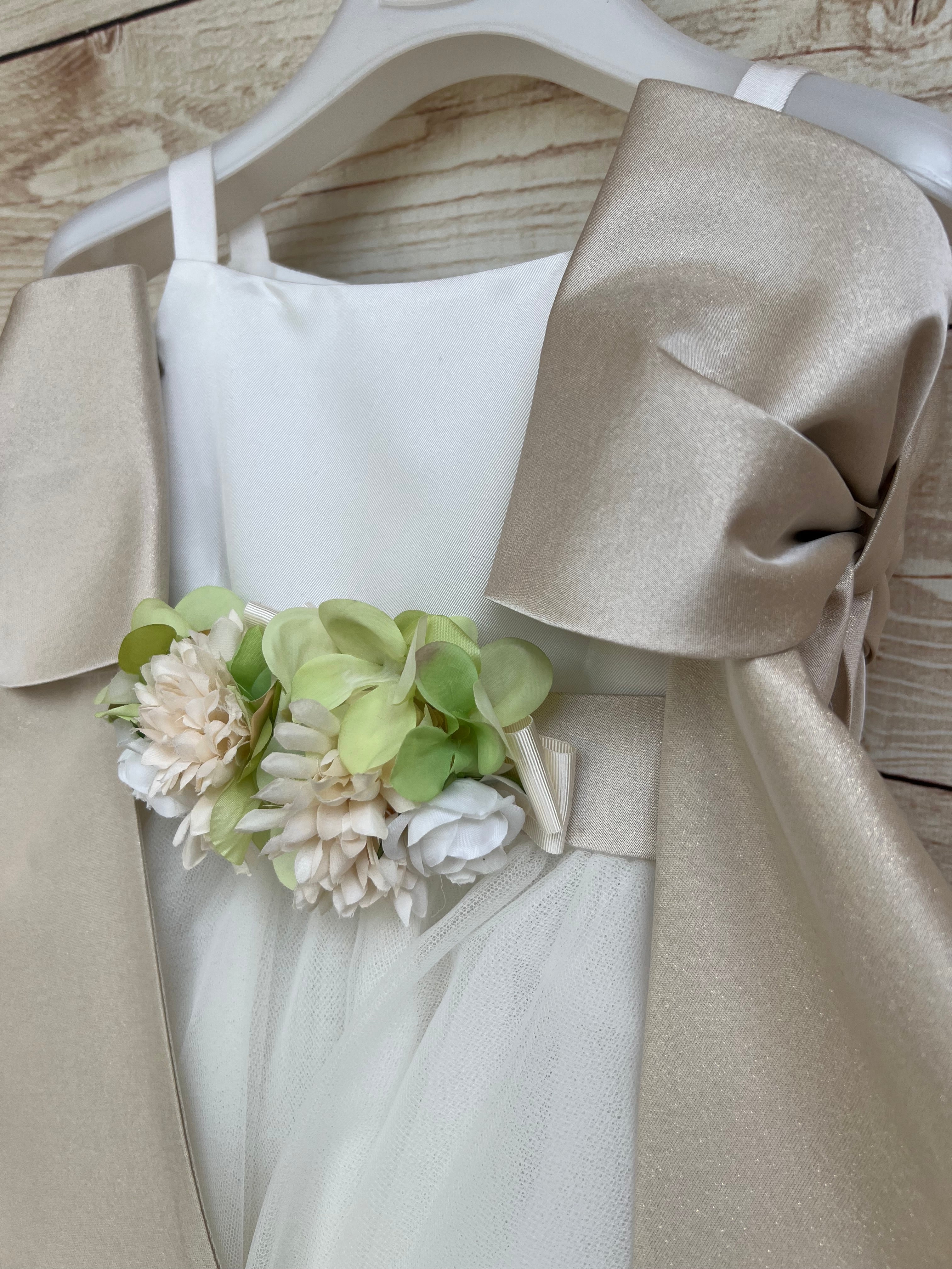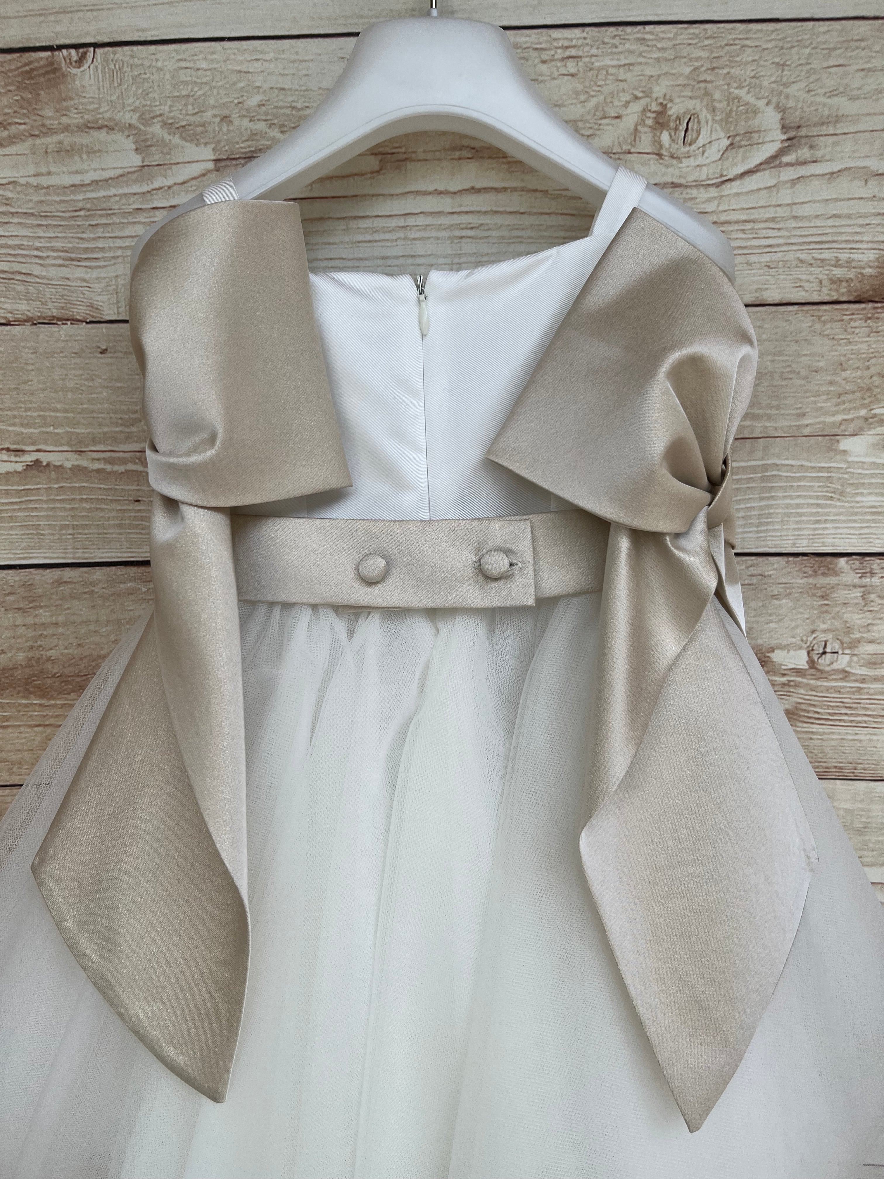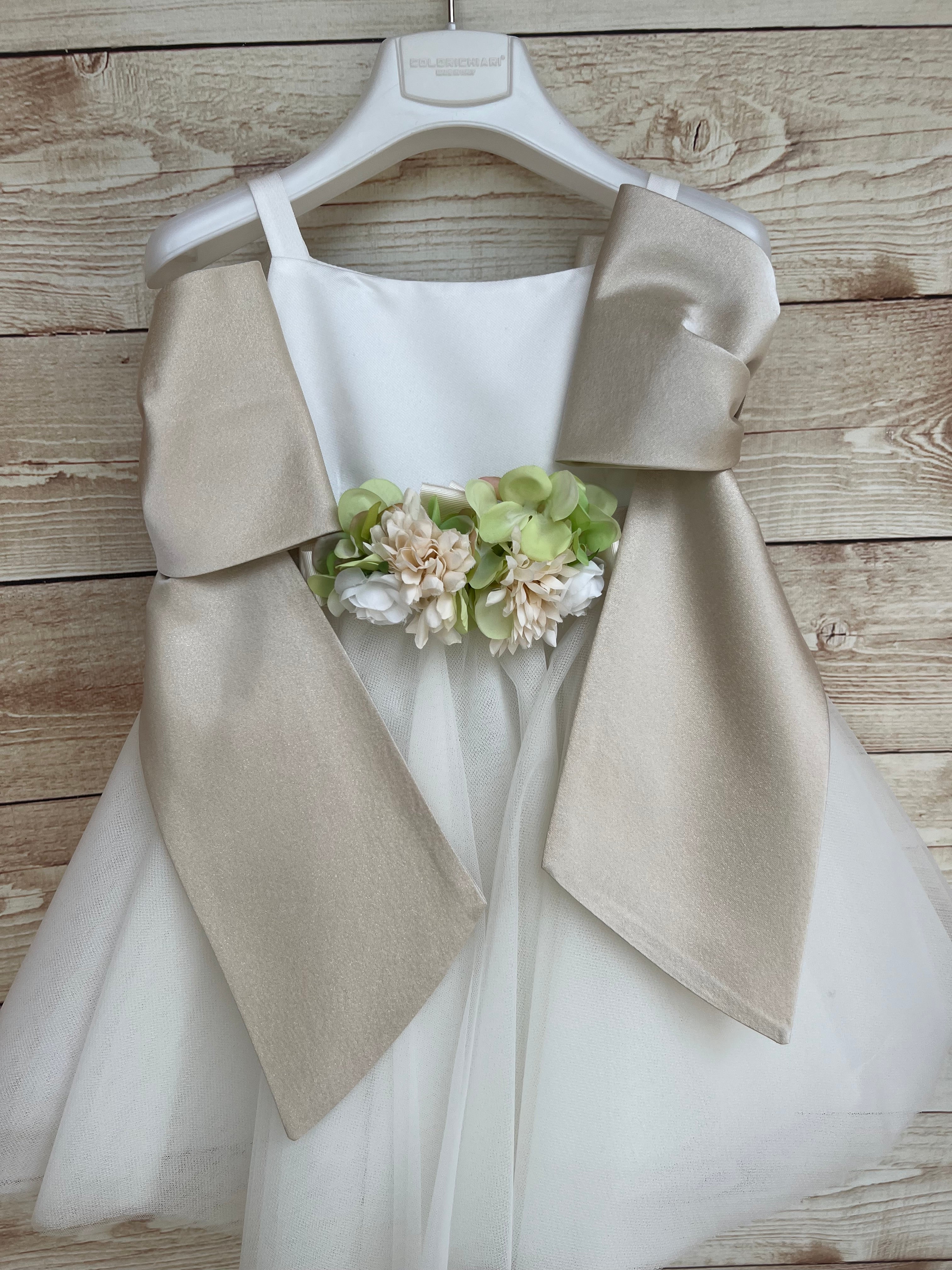 Due grandi fiocchi in raso beige laminato poggiano con grazia sulle spalle, richiamando la cintura in vita dello stesso colore, impreziosita da applicazioni floreali dal gusto romantico. Un abito dal design armonioso, pensato per far sentire ogni bambina speciale.