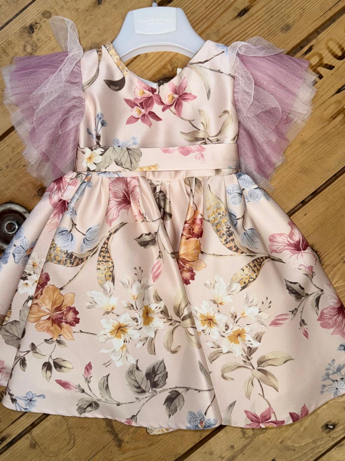 Delicatissimo abito in mikado in seta firmato Marlù. Fondo rosa con fantasia floreale e particolare in tulle sulla manica che rende l'abito grintoso e super glamour. Made in Italy