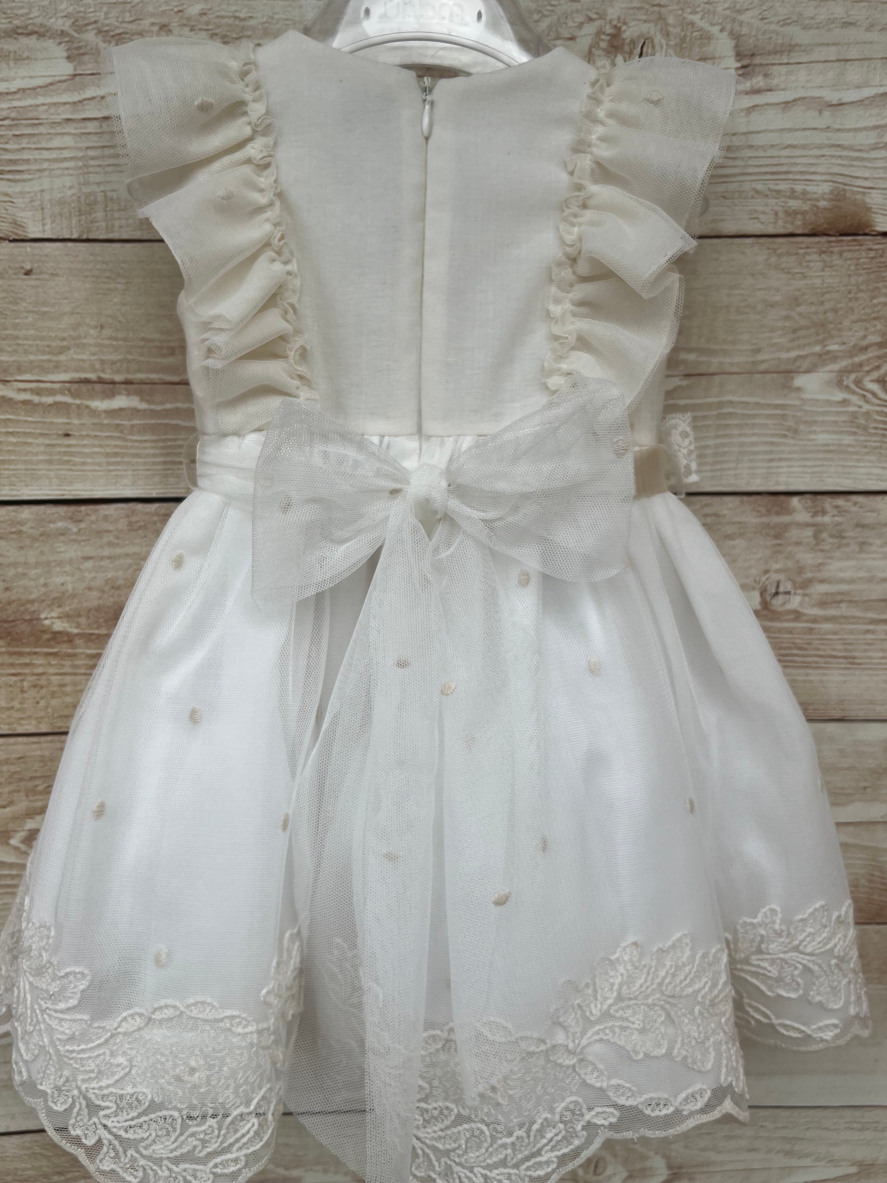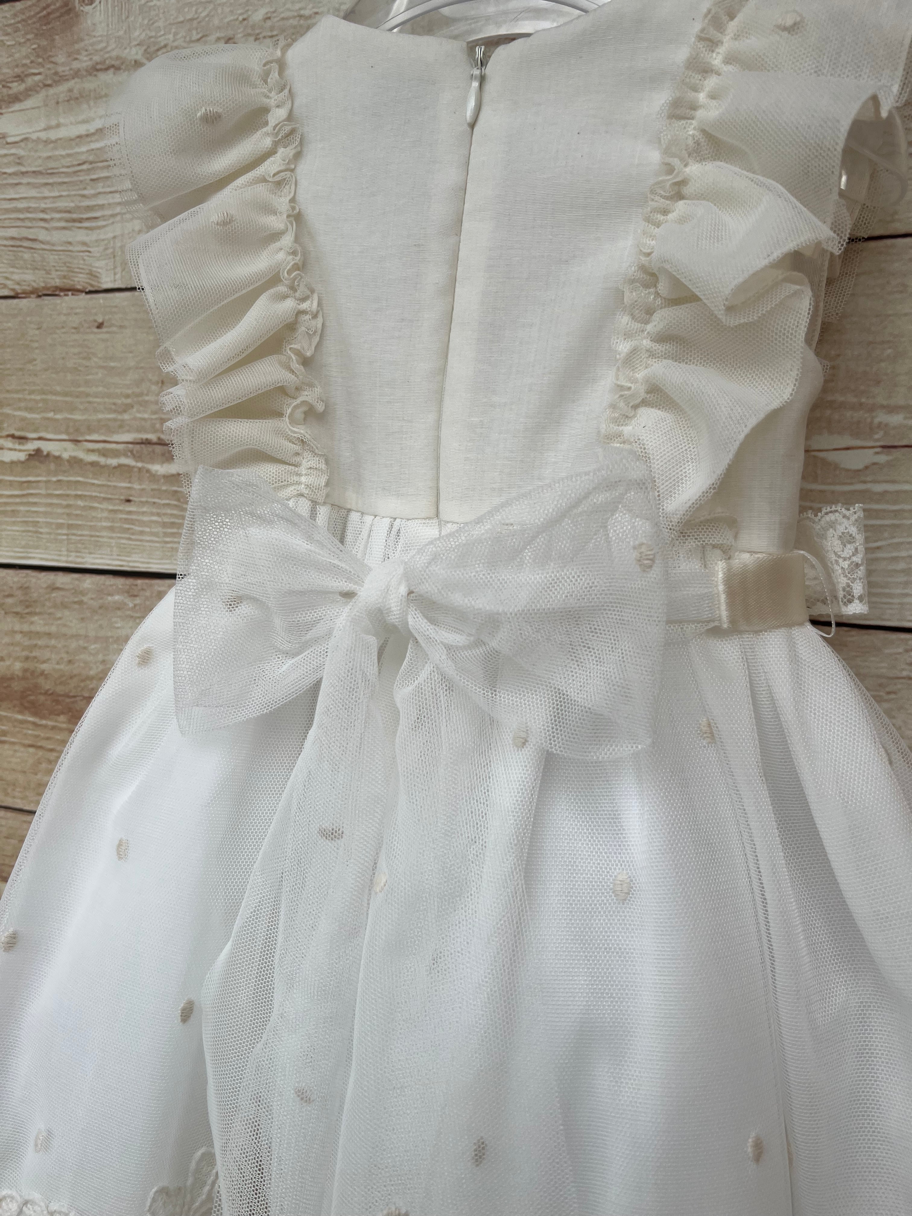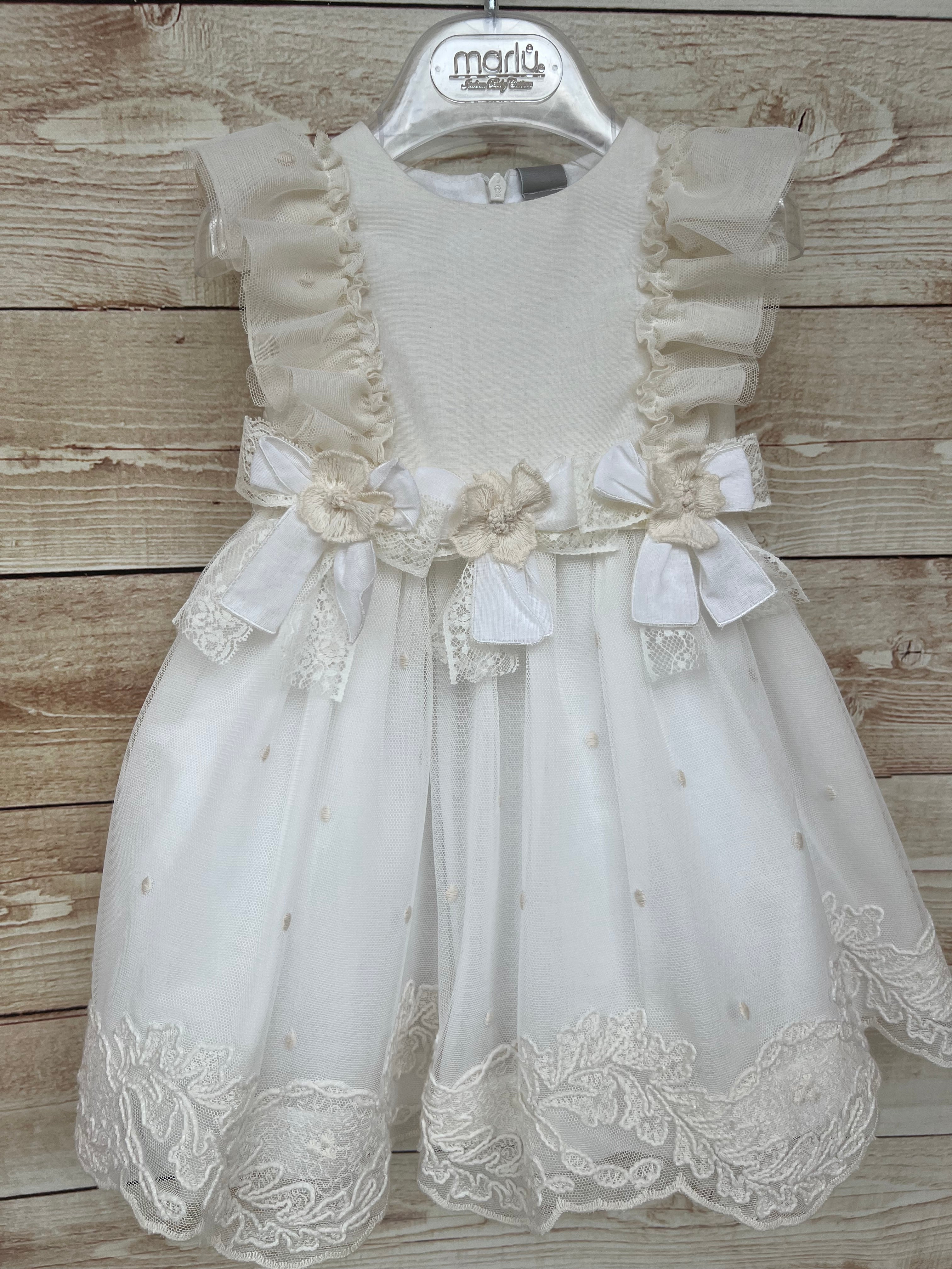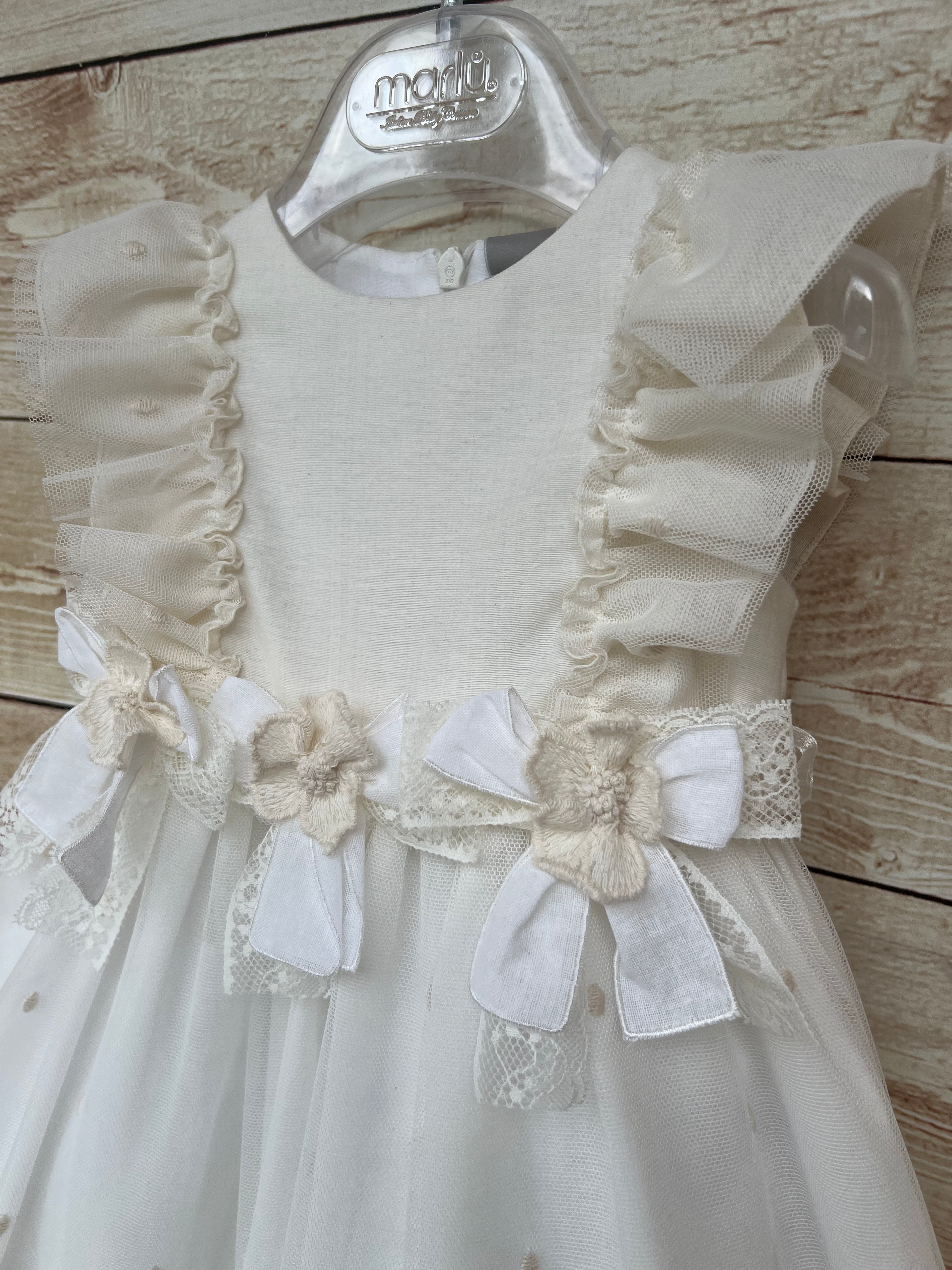 Delicato ed elegante abito Marlù cod ER305 in color lino, perfetto per cerimonie ed eventi speciali. Il corpetto in morbido cotone è impreziosito da raffinate rouge in tulle applicate sulle spalle, richiamo stilistico ripreso anche nel gonnellone in tulle vaporoso, rifinito da un elegante inserto in pizzo sul fondo.