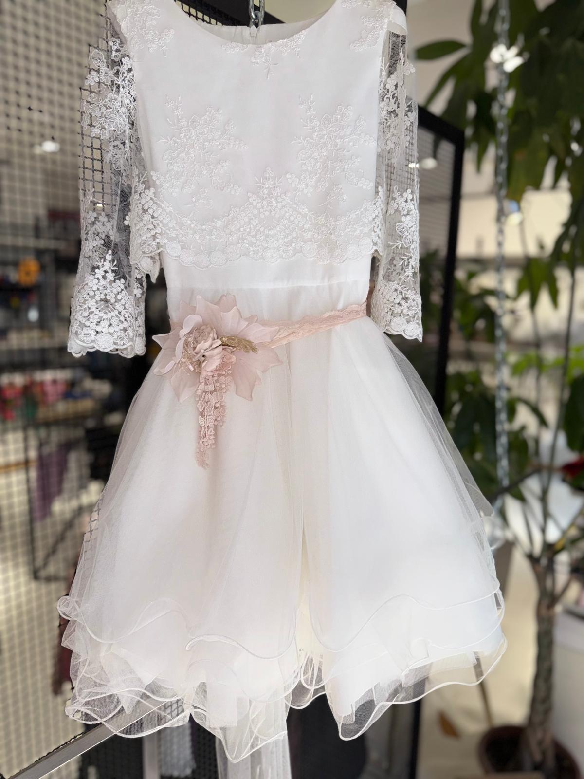 Elegantissimo abito Mimilù in tulle bianco con particolare corpetto in pizzo con manica a tre quarti. Impreziosito da cintura in vita rosa cipria con applicazione floreale.