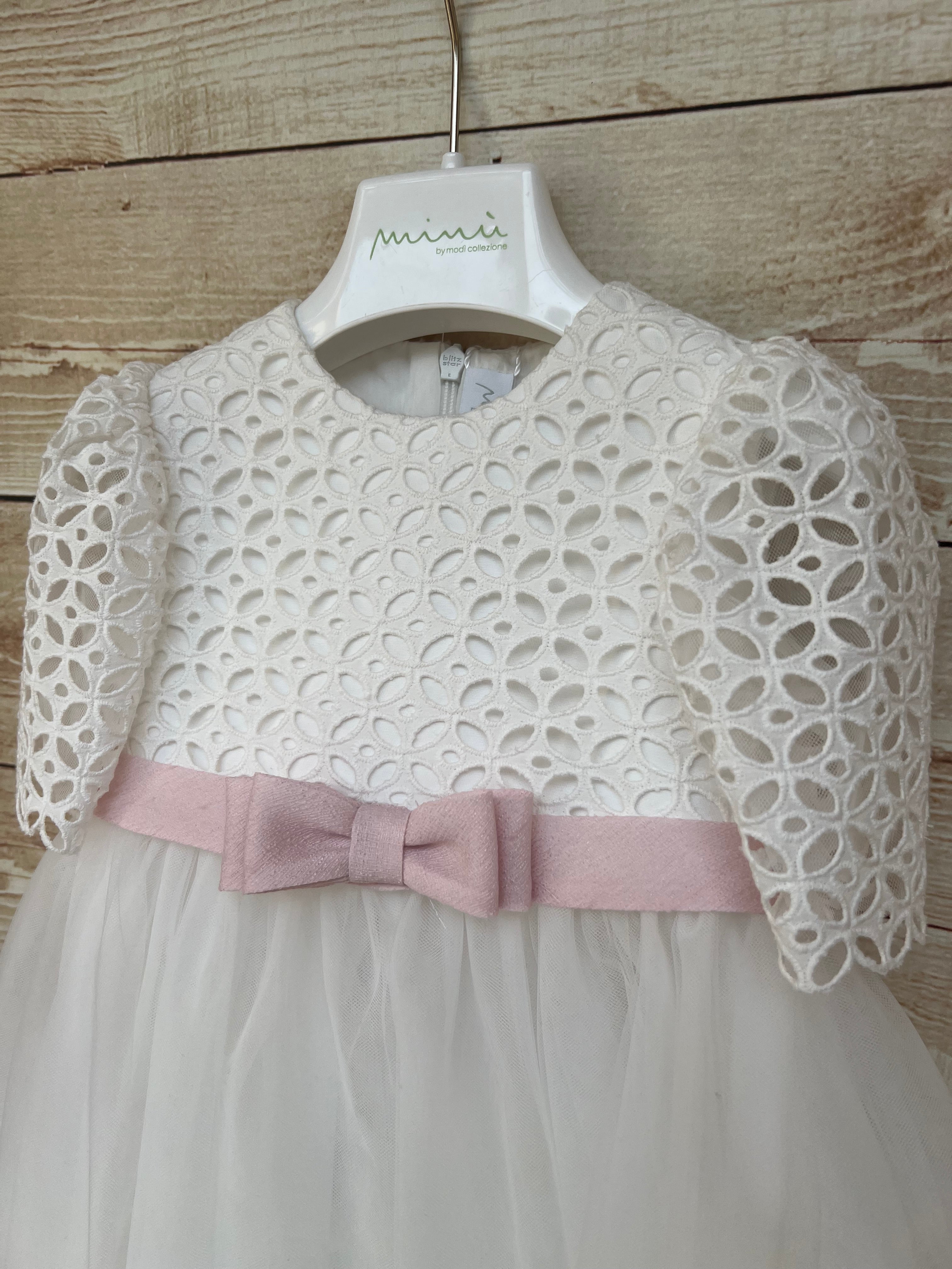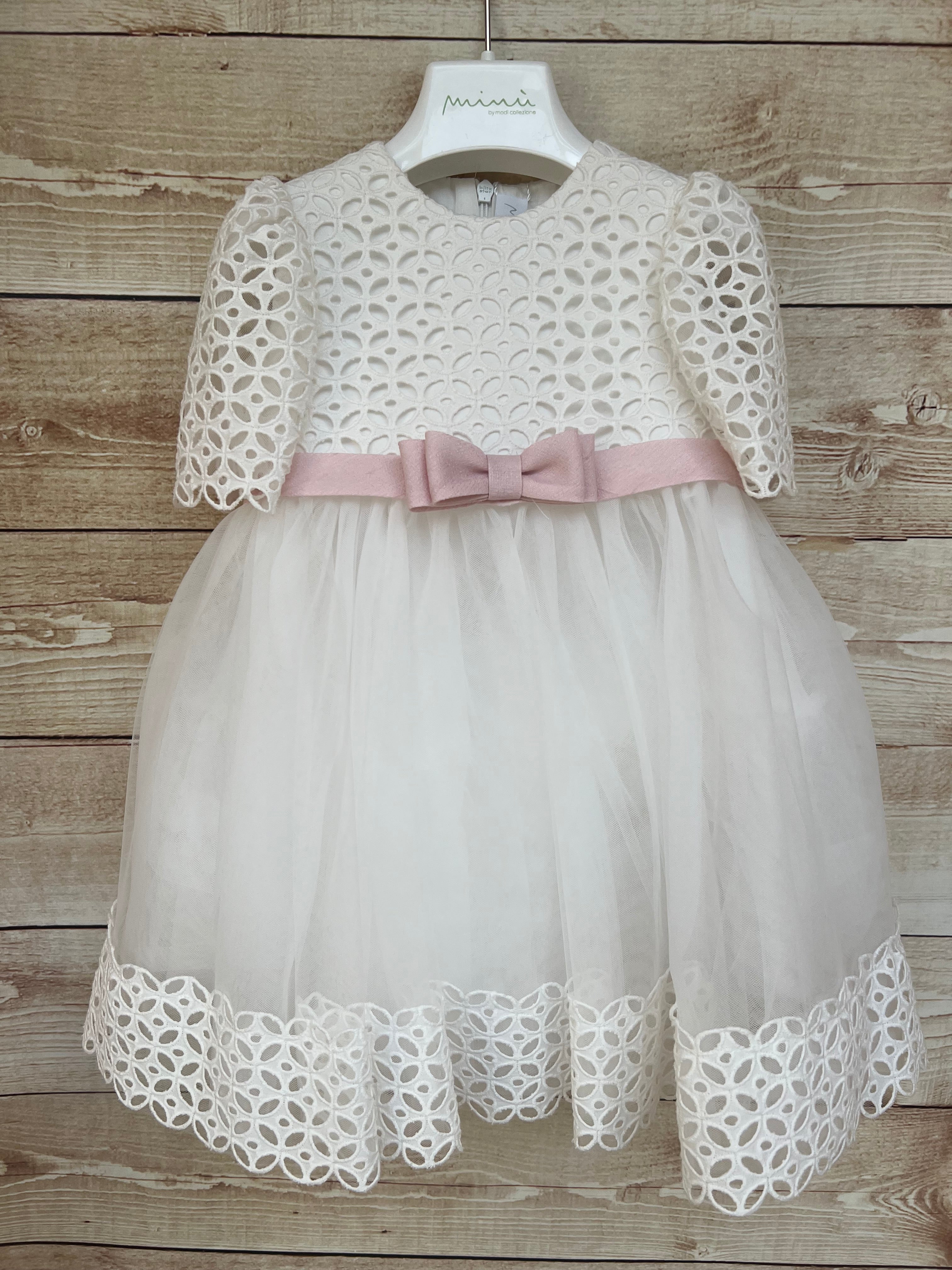 Delicato e raffinato, questo abito della collezione Minù by Modì cod N4038 è la scelta ideale per un'occasione speciale. Il corpetto è interamente realizzato in pregiato pizzo, con manichina corta leggermente a palloncino, per un tocco di dolcezza e raffinatezza.