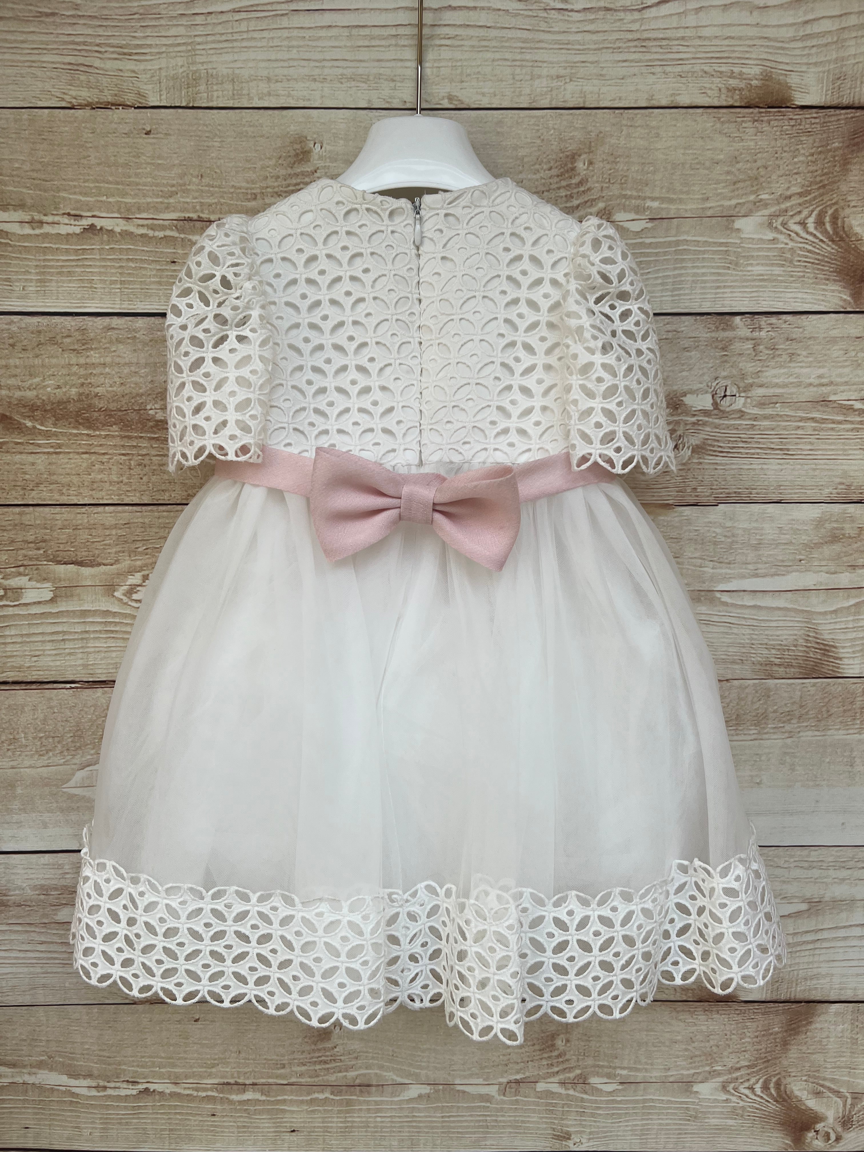 Il gonnellone in tulle leggero è impreziosito alla base dallo stesso pizzo del corpetto, per un effetto armonioso e ricercato. In vita, un elegante cinturino con fiocco color rosa, riproposto anche sul retro, completa il look con equilibrio e romanticismo.
