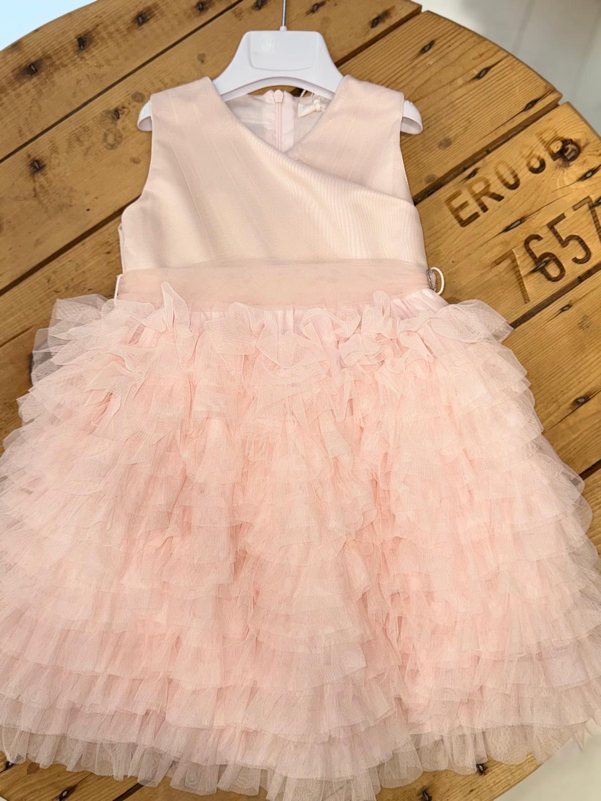 Raffinato abito firmato Ninnaoh in colore rosa. Giromanica e scollo a V con particolare gonna a balze. MAde in Italy