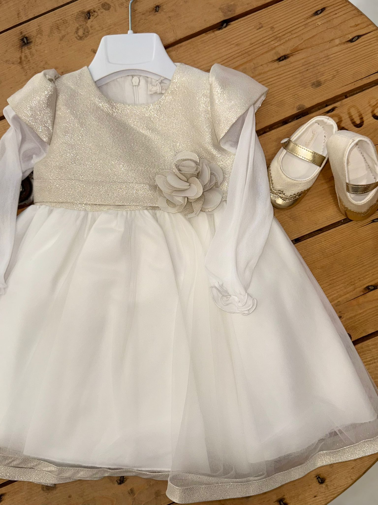 Raffinato abito oro e avorio firmato Ninnaoh. La manica lunga in organza lo rende elegante e perfetto per le occasioni di tutte le stagioni. Made in Italy
