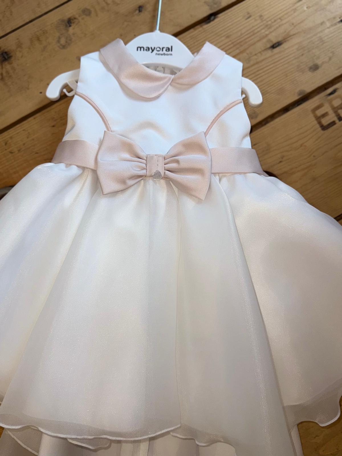 Elegante e raffinato abito firmato Ninnaoh. In colore bianco e rifinito con colletto e ecintura in vita in rosa. Coda leggermente più lunga rispetto al davanti. Made in Italy