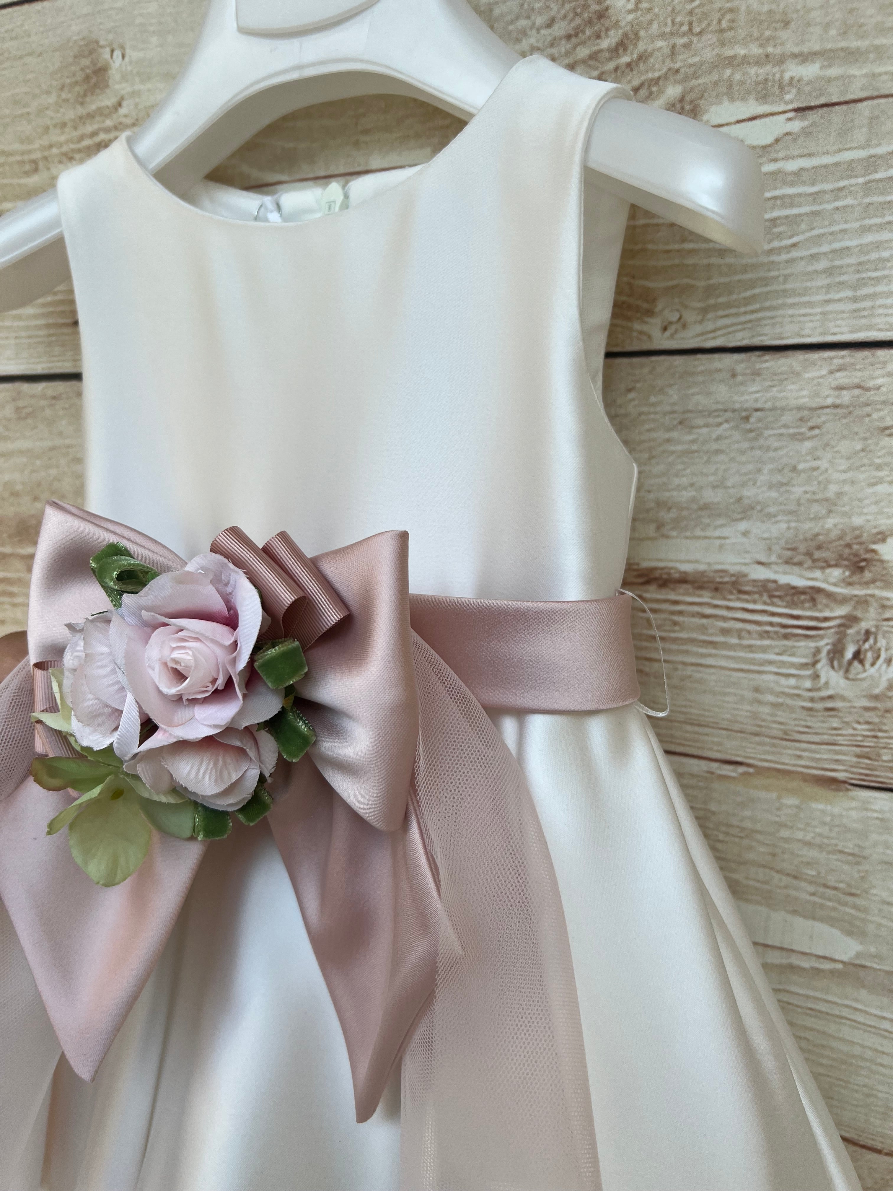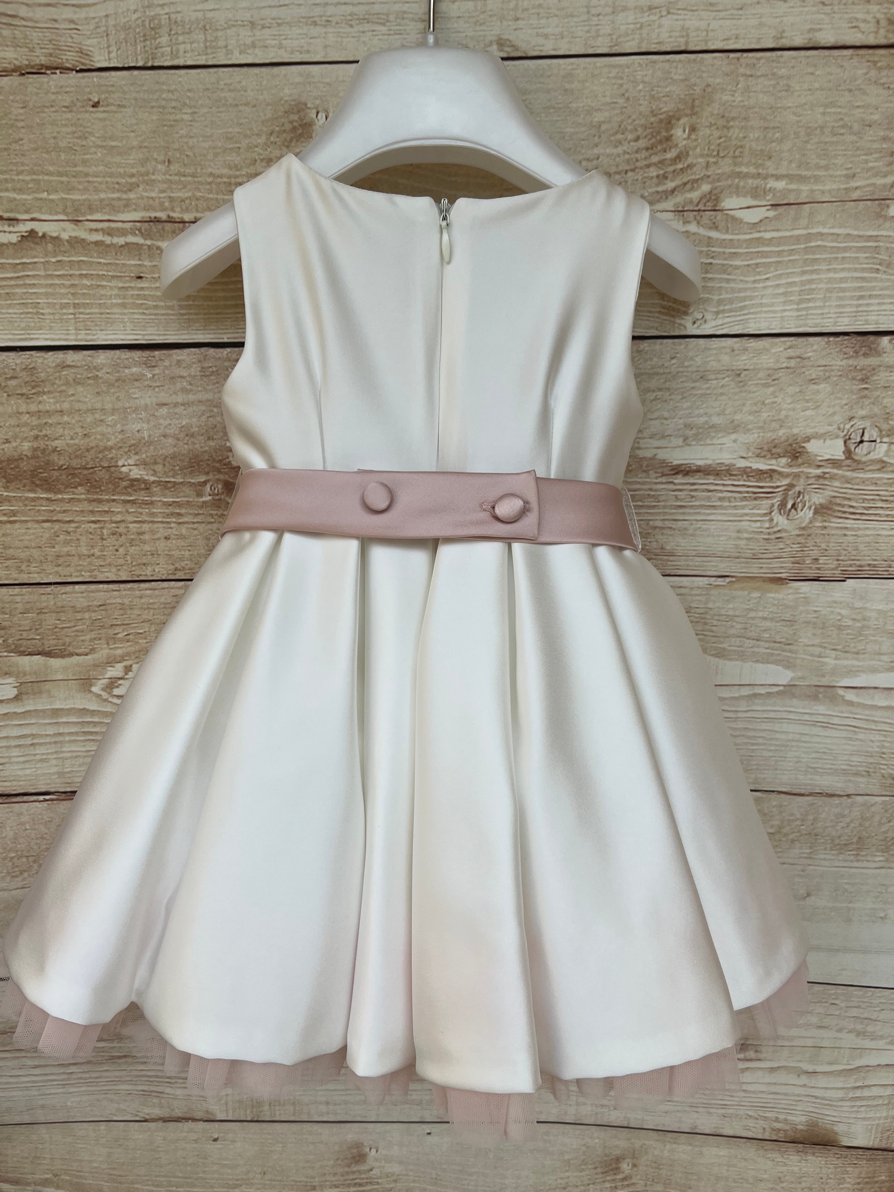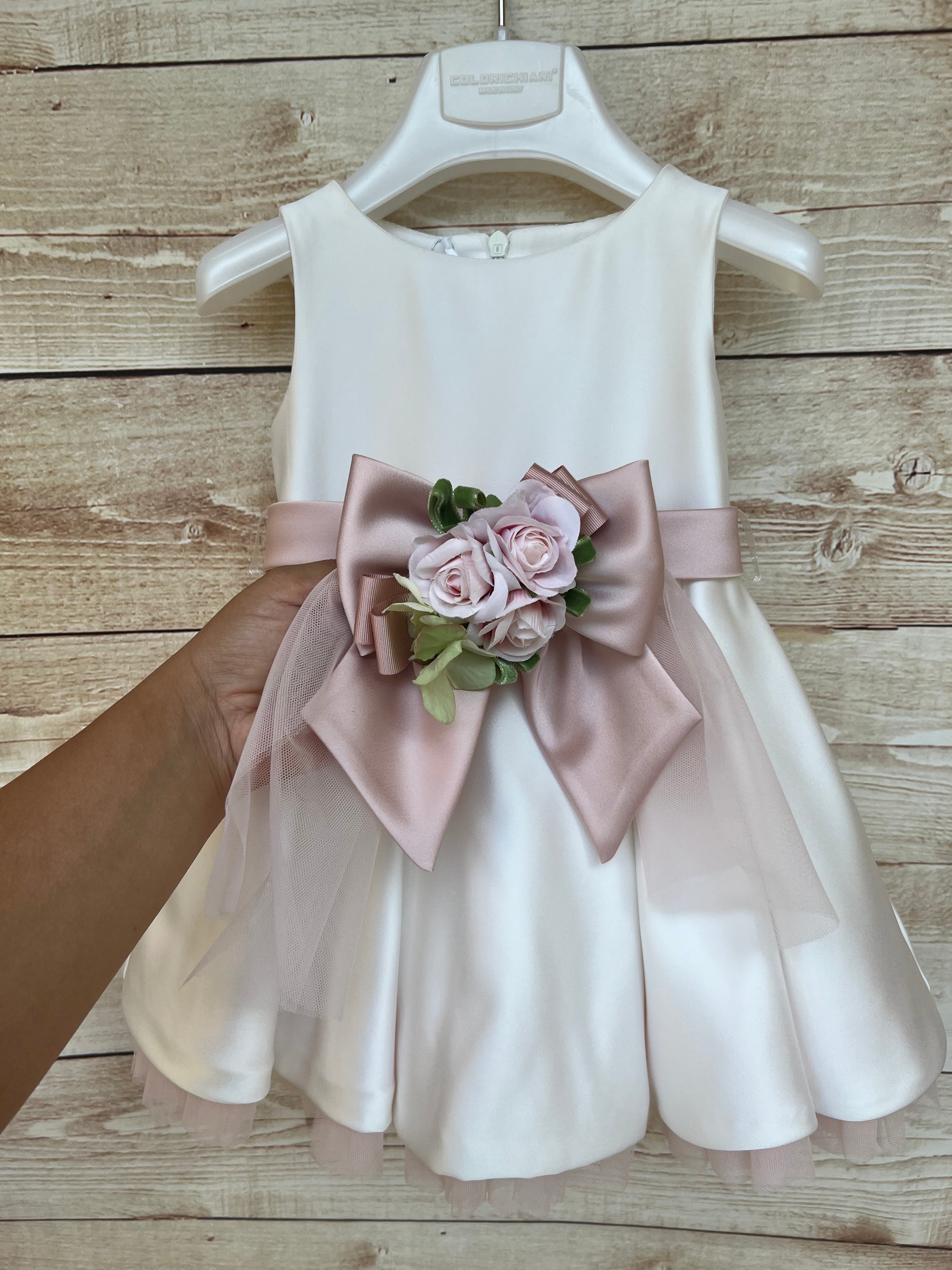 Il modello è valorizzato da un cinturino in mikado rosa, che sottolinea delicatamente il punto vita e si completa con un fiocco centrale arricchito da una romantica applicazione floreale.