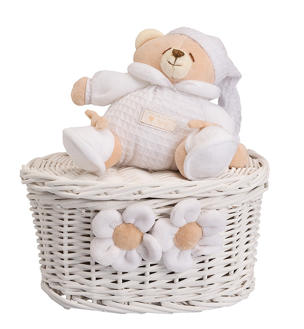 Il baule portaoggetti di Nanan è realizzato in vimini naturale e intrecciato a mano, all'interno è ricoperto in tessuto piquet di cotone puro, sul coperchio è stato applicato l'orsetto Tato realizzato in morbida ciniglia, mentre sul davanti del baule sono state applicate 3 graziose margherite in ciniglia. Può essere utilizzato per riporre giocattoli, colori e piccoli oggetti del tuo bambino.