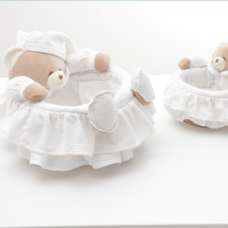 I cestini portaoggetti Nanàn della collezione Tato sono in vimini naturale intrecciato a mano, completamente ricoperti in tessuto piquet di puro cotone, impreziositi dall'applicazione in morbida ciniglia dell'orsetto Tato che abbraccia dolcemente i cestini. E' un utilissimo contenitore, un cesto delle meraviglie in cui riporre i giocattoli, i colori, e tutti i piccoli oggetti del tuo bebè. Per poter tenere la cameretta sempre ordinata! Tato è un tenero compagno del tuo bambino, e lo accompagna in ogni momento della sua giornata!