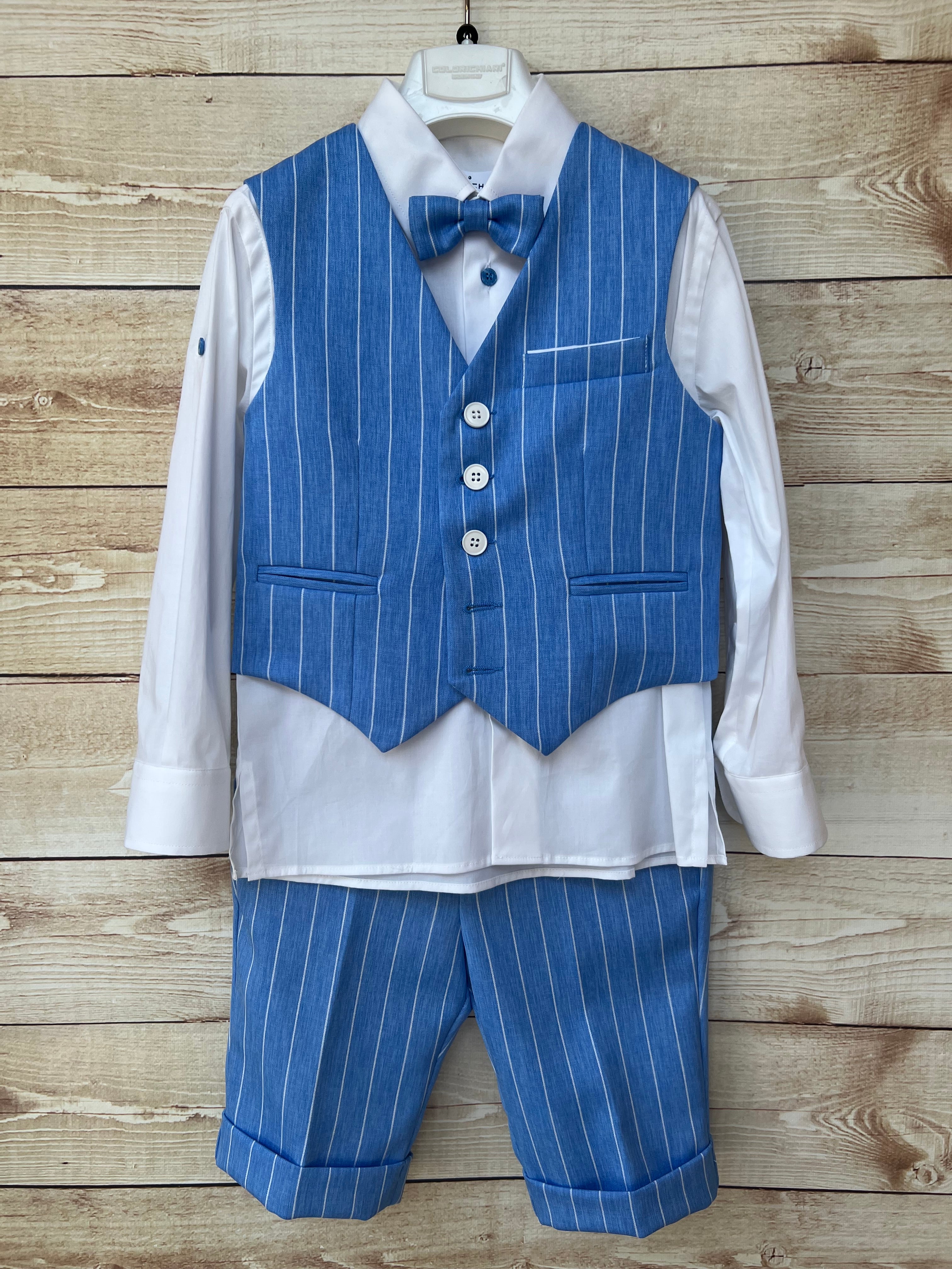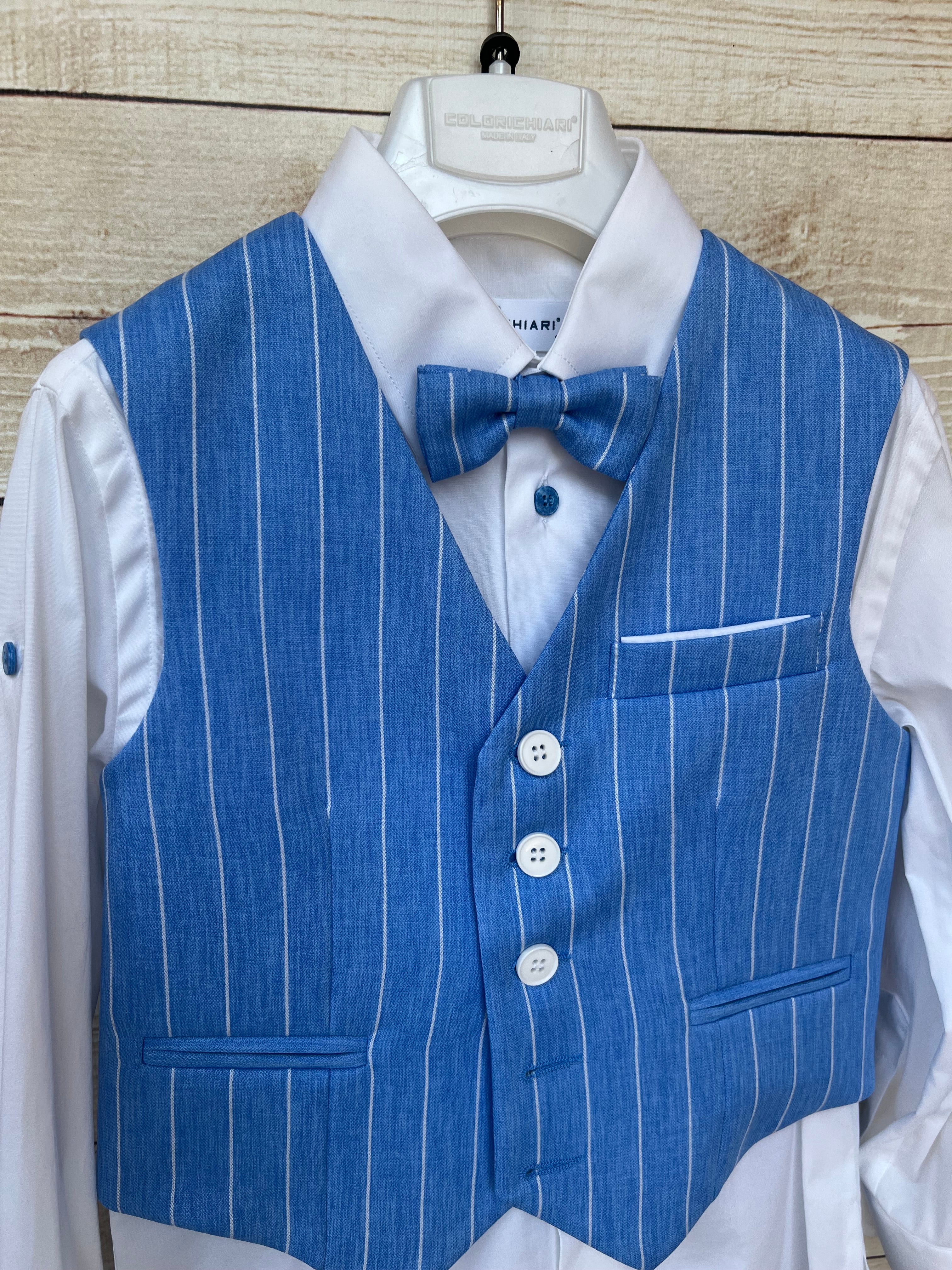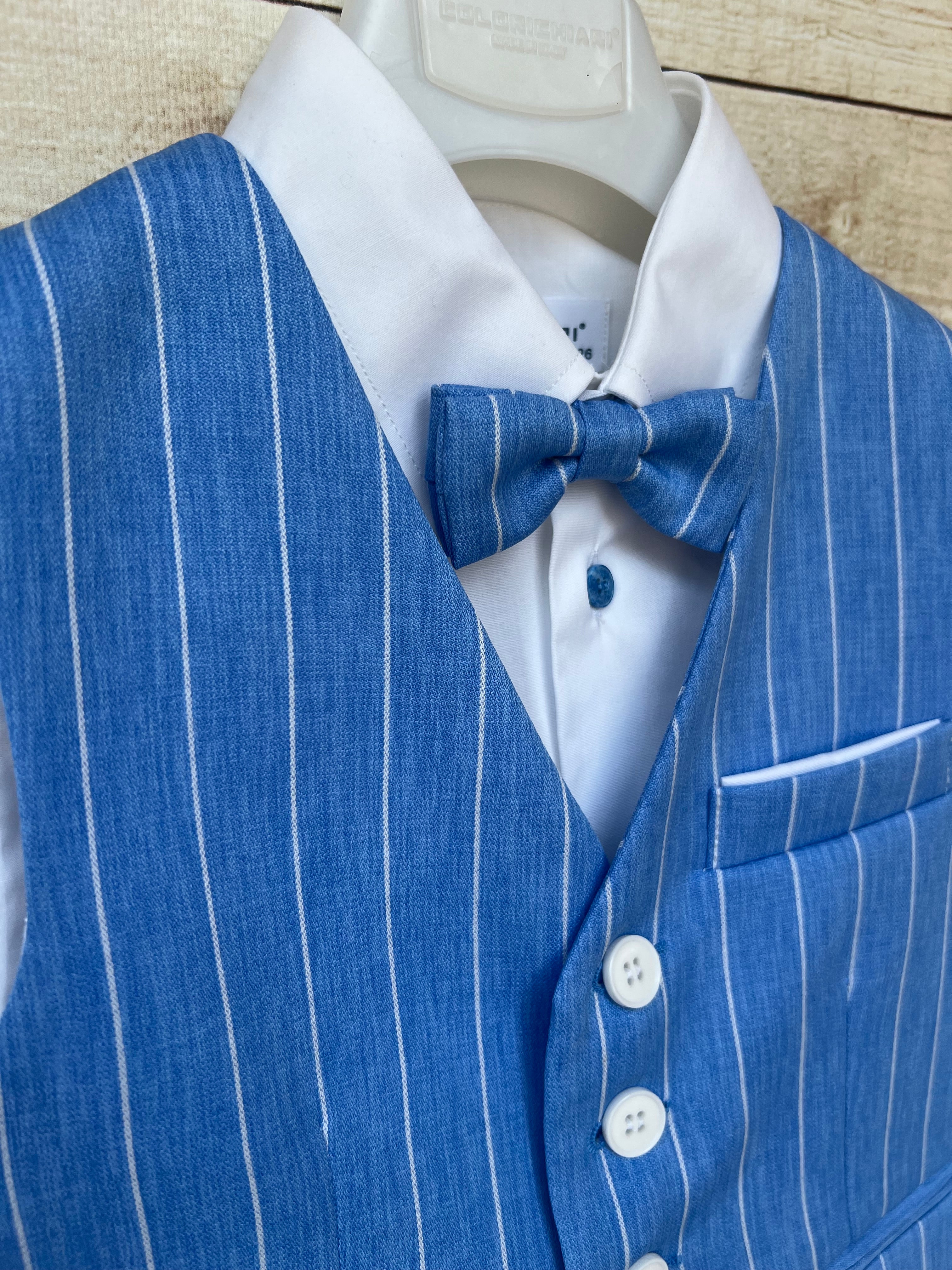 Raffinato completo 4 pezzi composto da camicia bianca, gilet, bermuda e papillon in tessuto blu avio a righe bianche. Il gilet è impreziosito da bottoni a contrasto e taschino decorativo, mentre il bermuda ha risvolto sul fondo per un tocco ancora più curato. Il papillon coordinato completa l’outfit, perfetto per cerimonie ed eventi speciali.