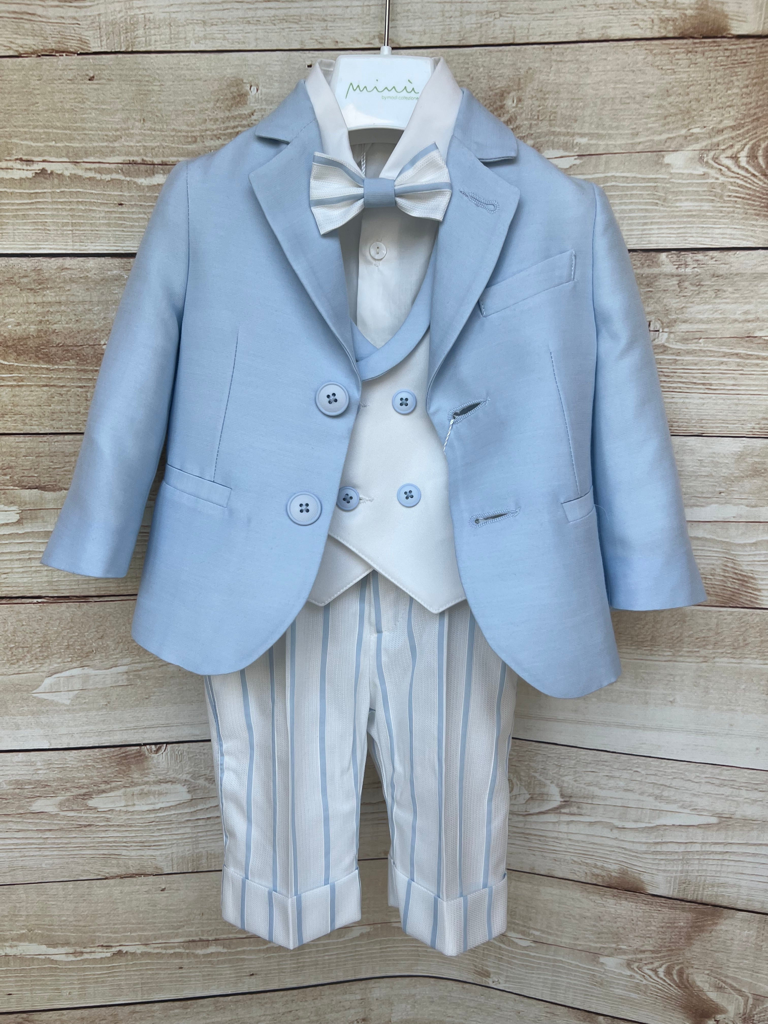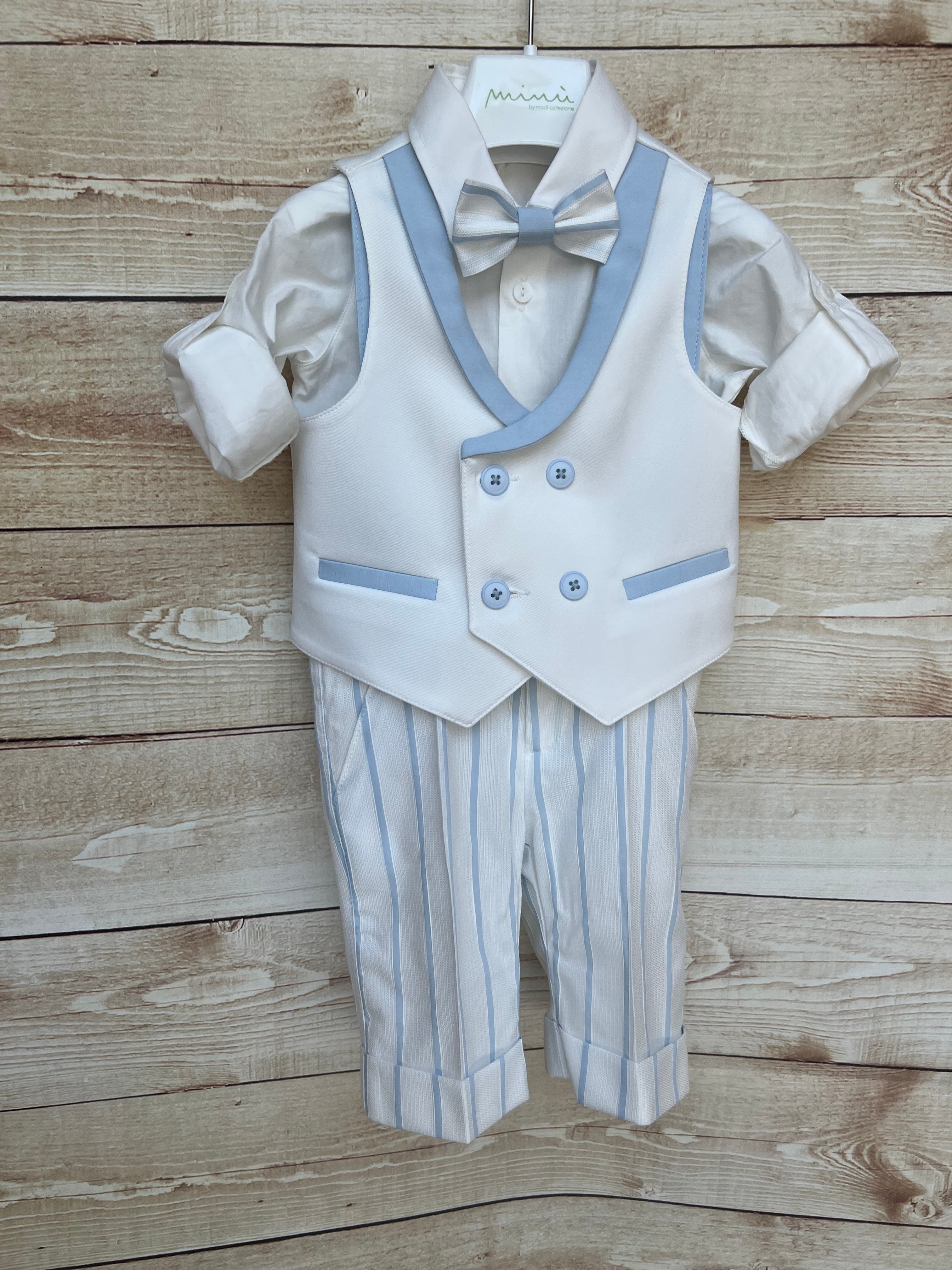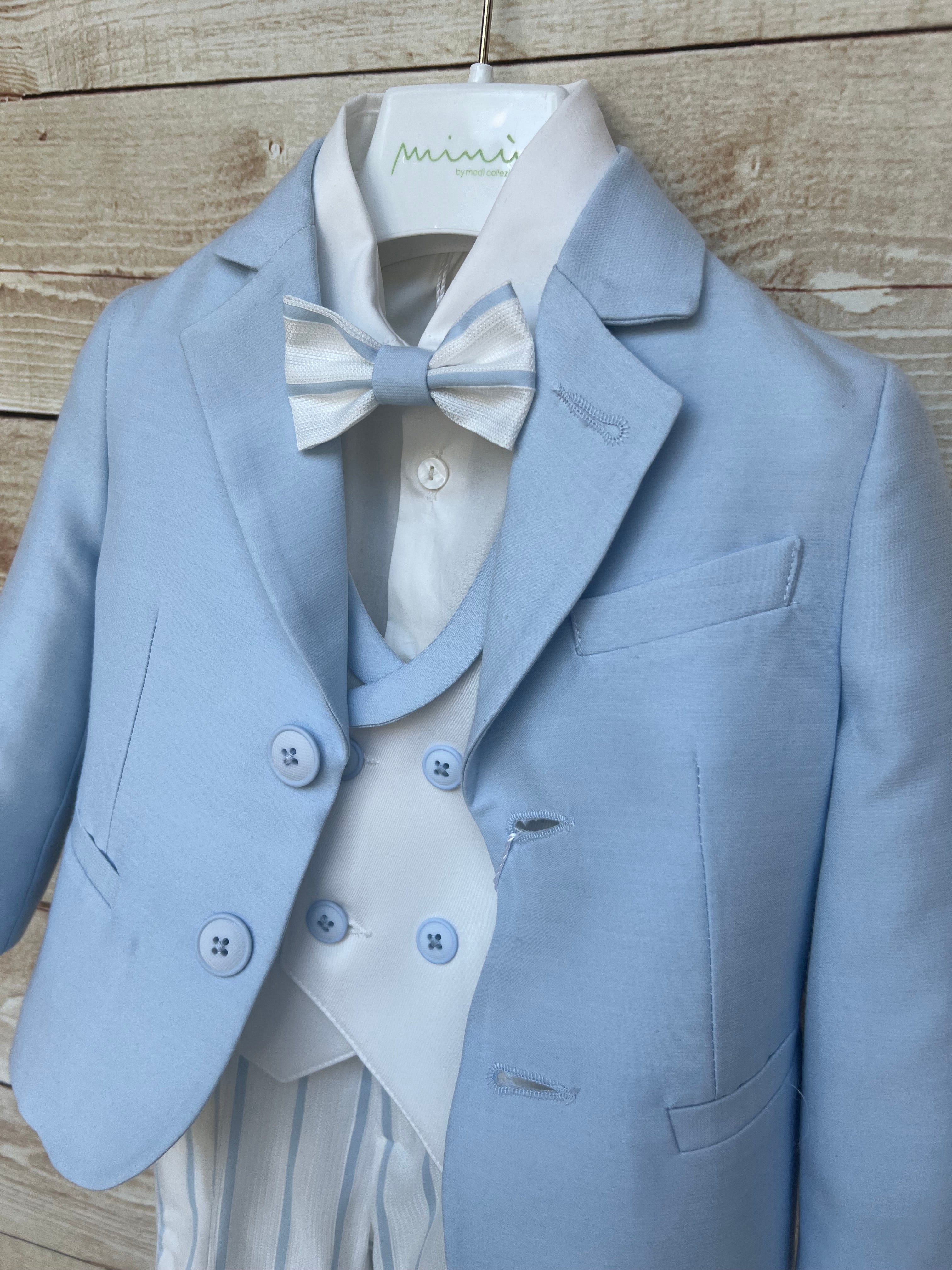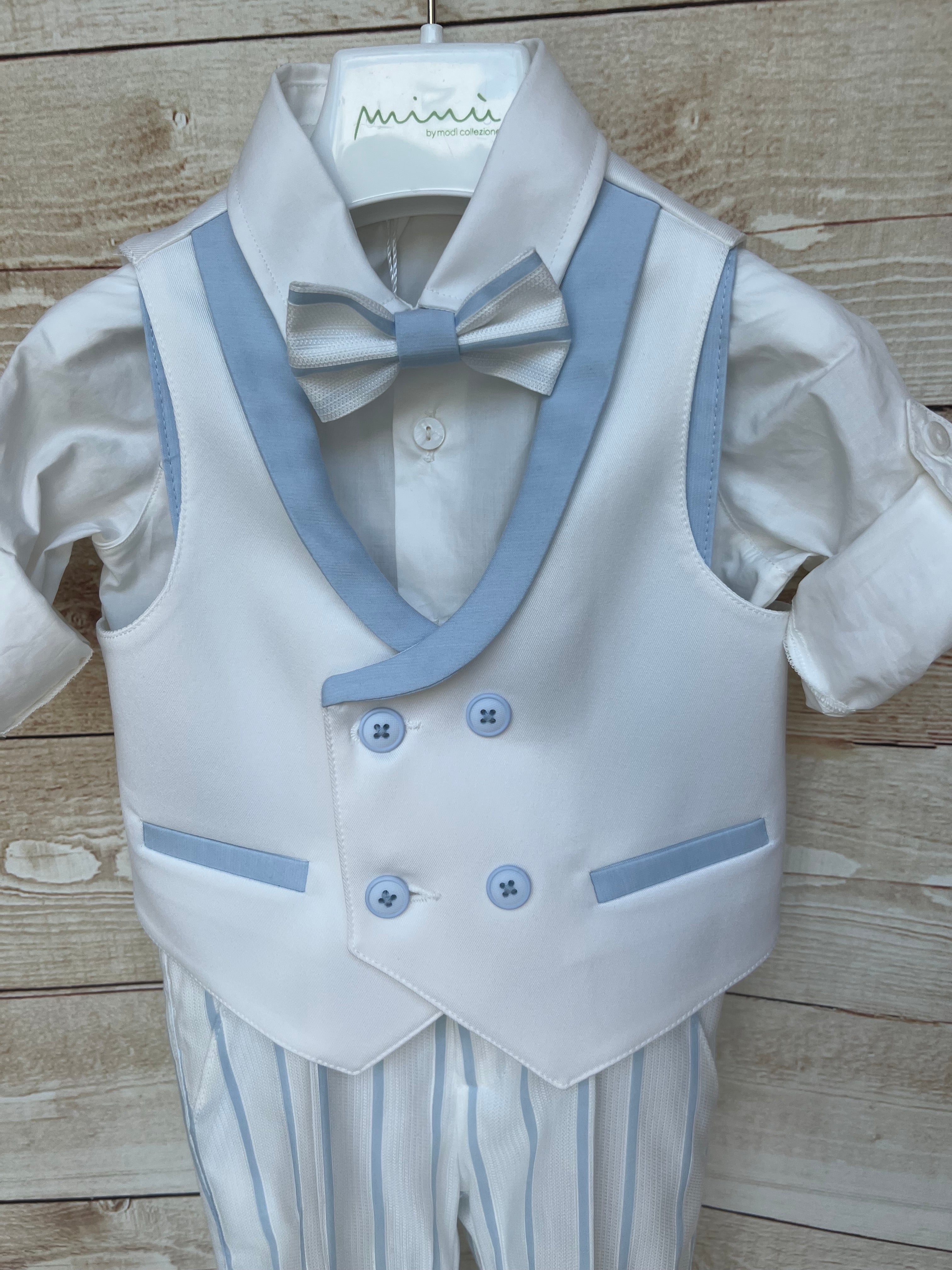 Raffinato completo cerimonia composto da camicia, bermuda con bretelle, gilet, giacca e papillon. Realizzato in delicati toni del bianco e dell’azzurro, si distingue per l’eleganza del gessato bianco a righe azzurre presente su bermuda e papillon.