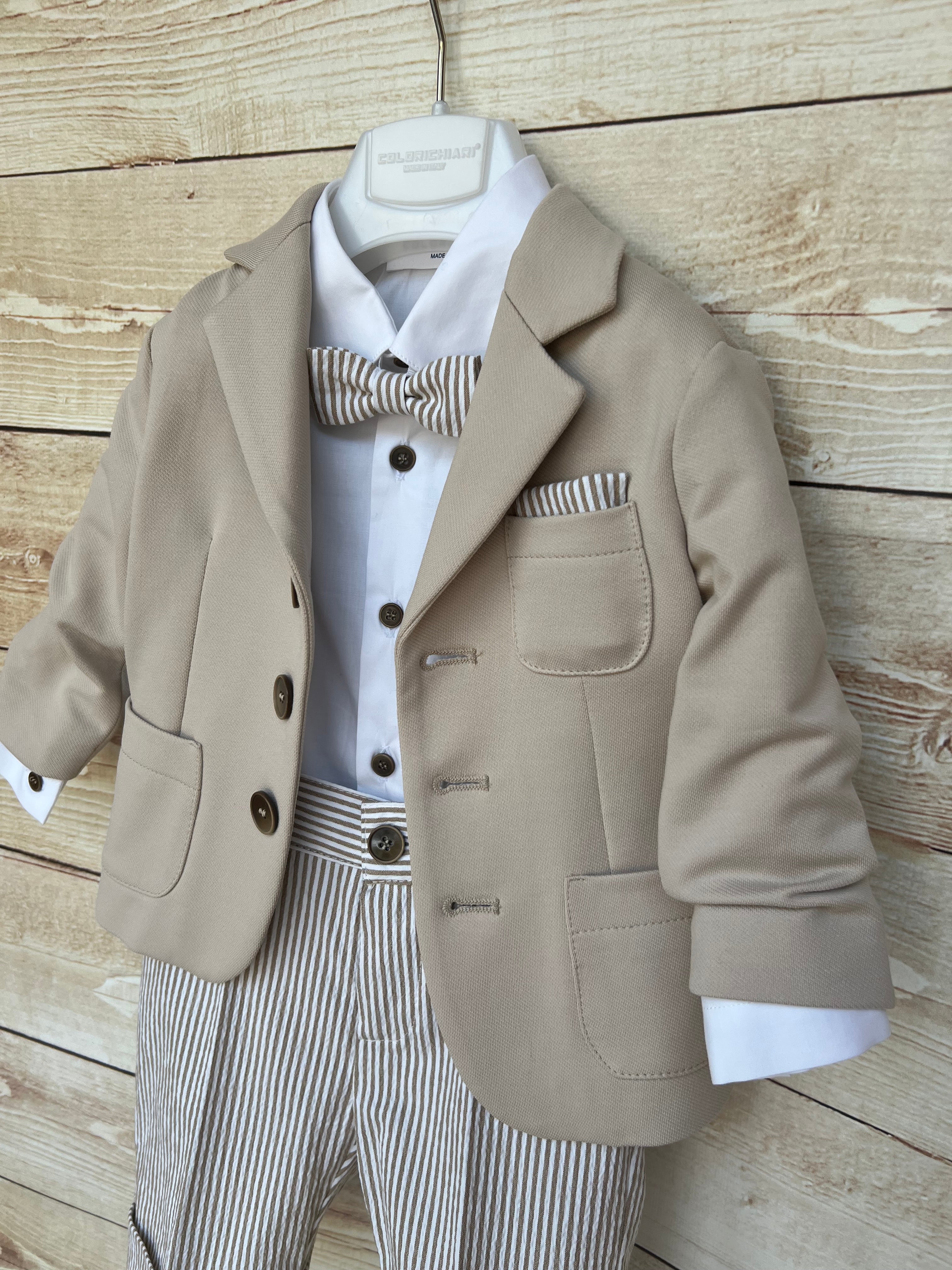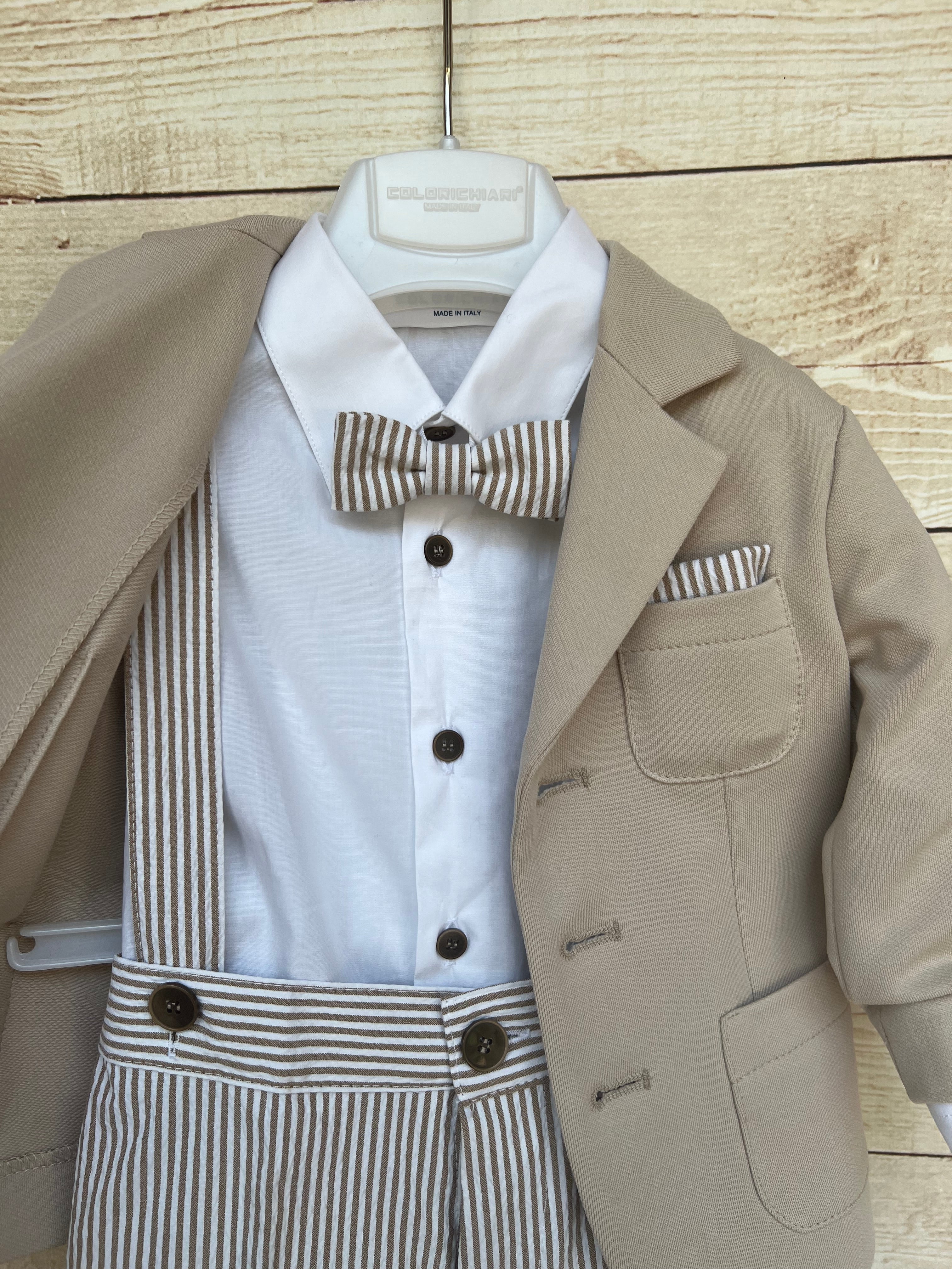 Raffinato completo cerimonia firmato Colorichiari cod MN508081 composto da bermuda con bretelle, camicia, giacca e papillon. Realizzato in delicati toni del beige e bianco, si distingue per l’eleganza della fantasia a righe presente su bermuda e papillon.