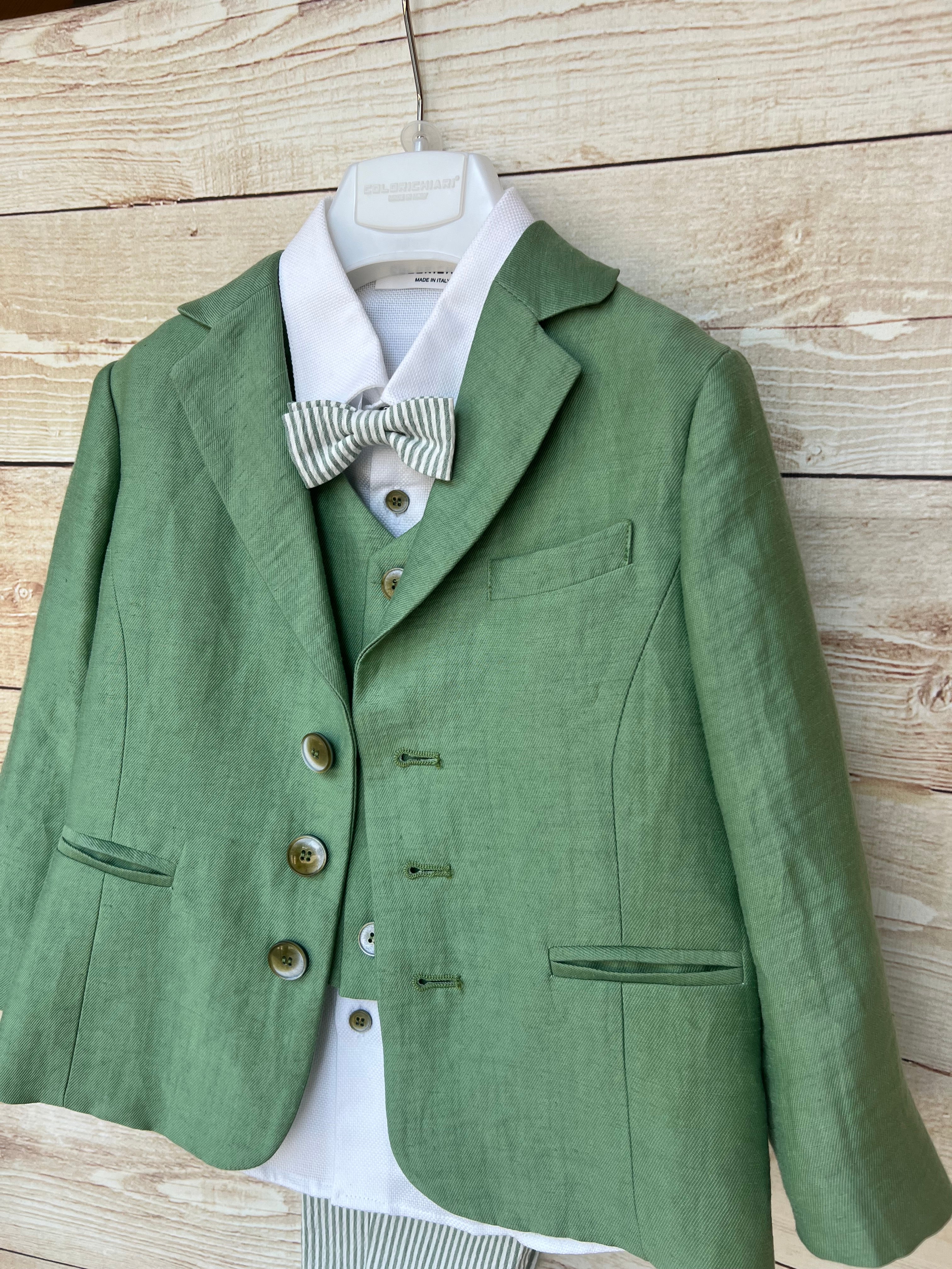 Elegante completo 5 pezzi composto da giacca e gilet in raffinato lino verde, camicia bianca, pantaloni rigati nei toni del verde salvia e bianco, e papillon coordinato. Un outfit ricercato e fresco, ideale per cerimonie, battesimi e occasioni speciali.