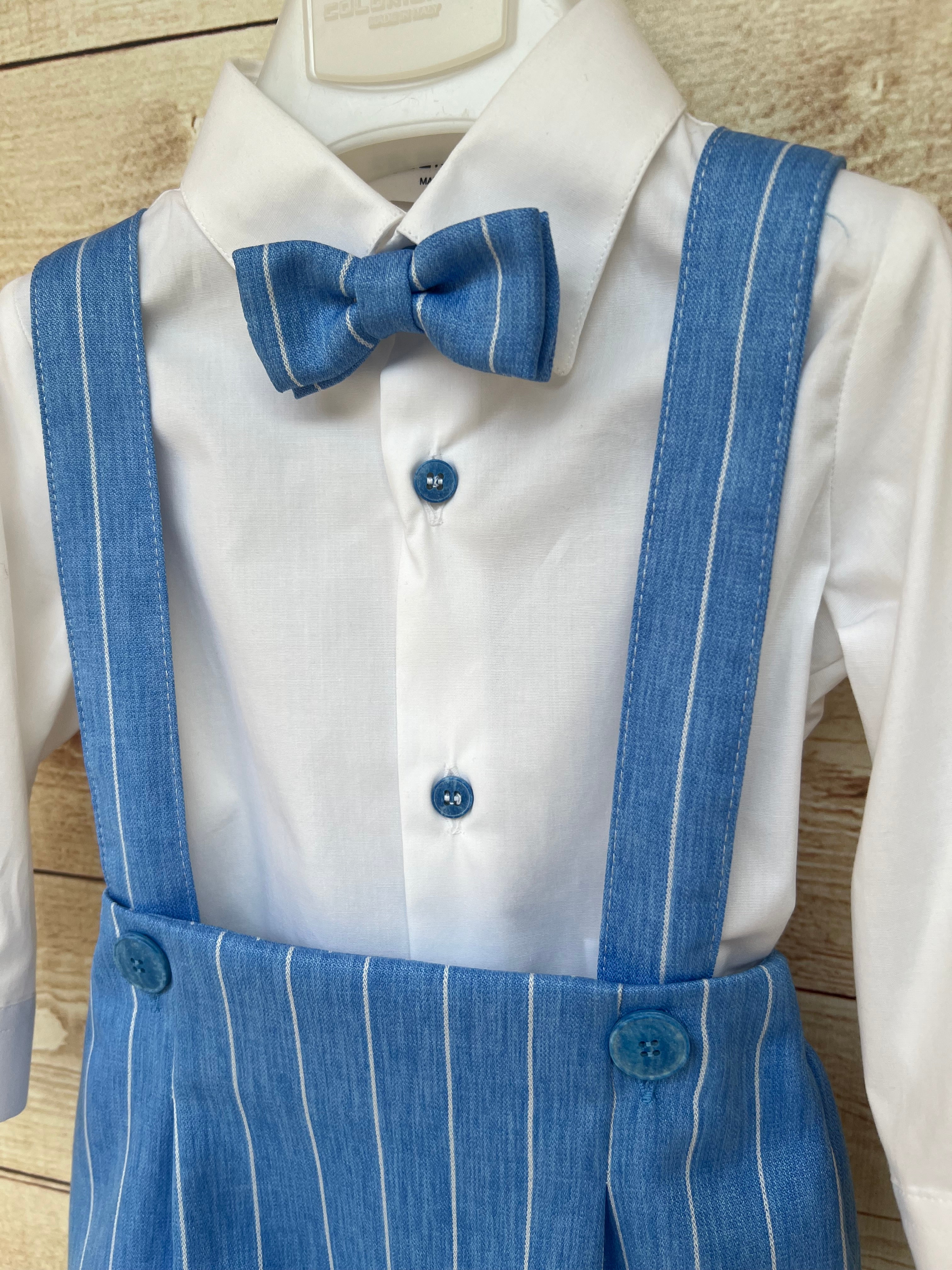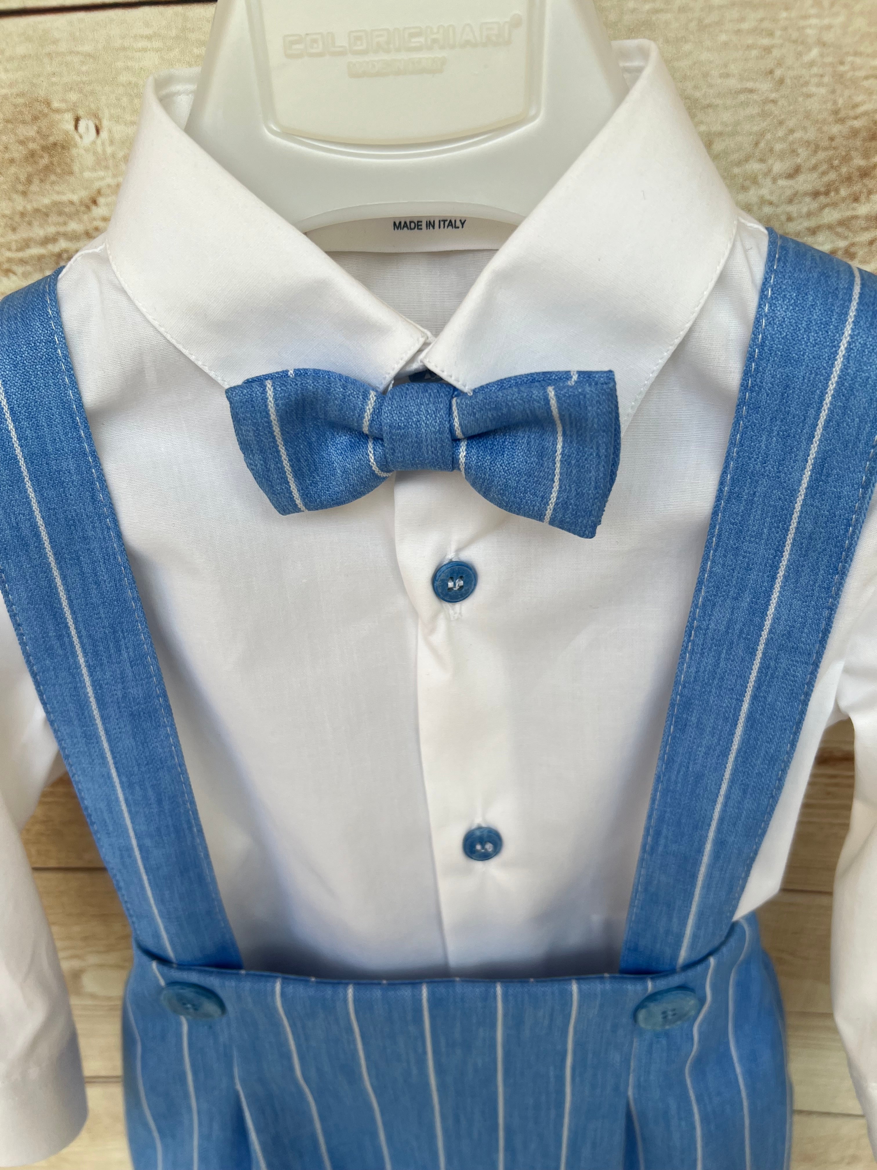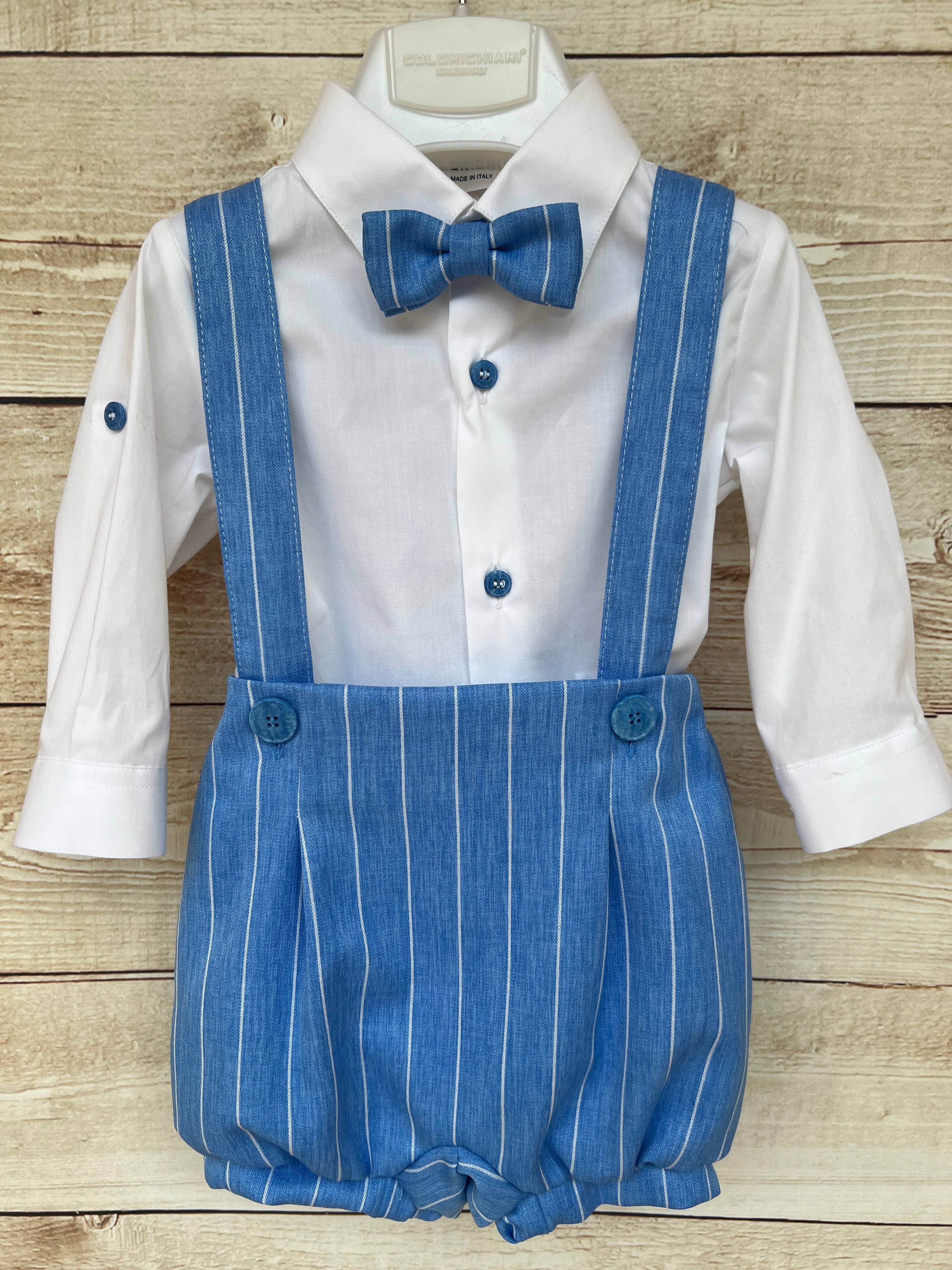 Delizioso completo da cerimonia per bimbo firmato Colorichiari cod MN307548, composto da camicia bianca a manica lunga, papillon coordinato e culotte con bretelle.