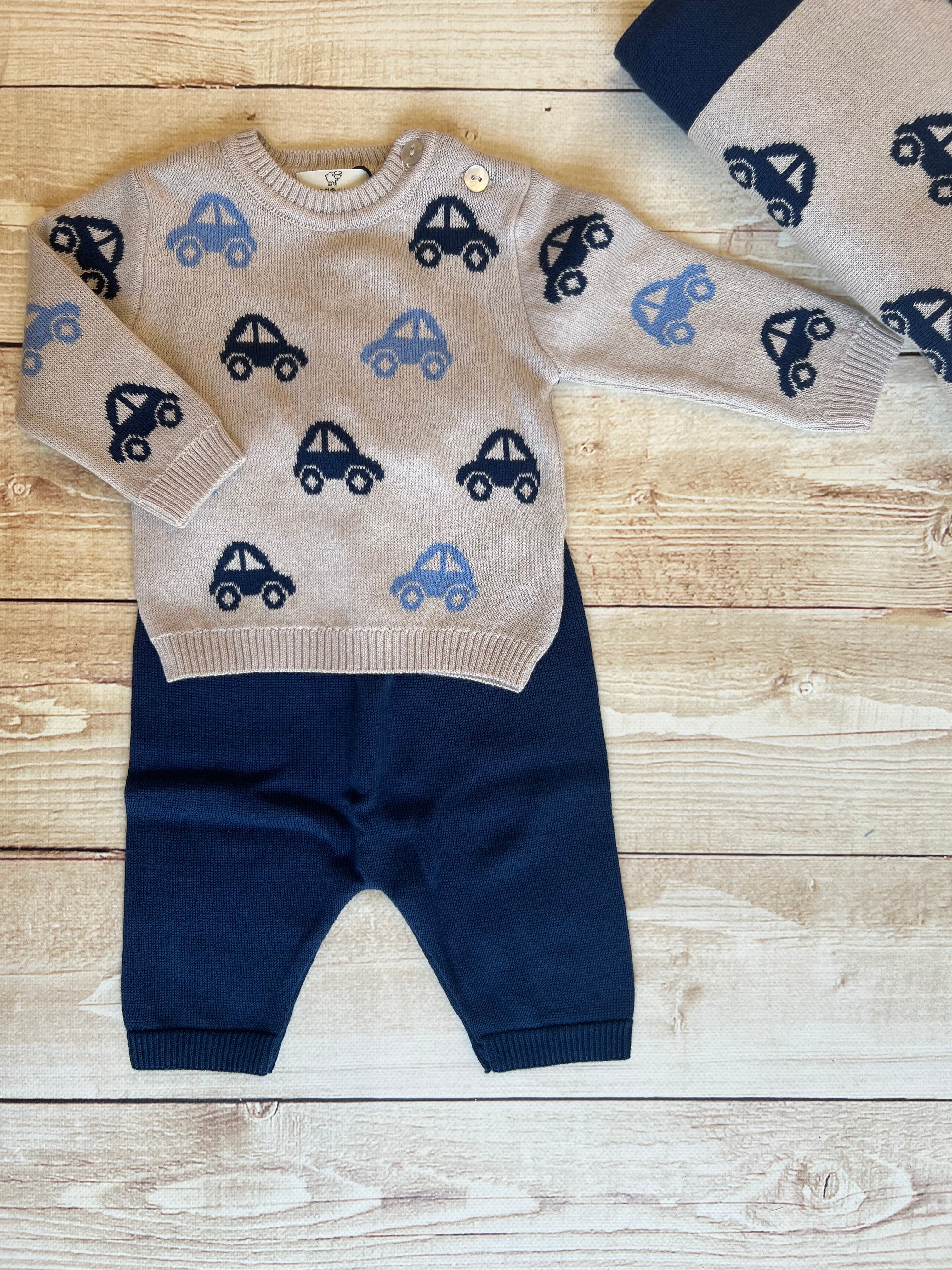 I toni raffinati del blu e sabbia si uniscono a un dolce disegno di macchinine a contrasto, rendendola perfetta per coccolare il tuo bimbo con stile.