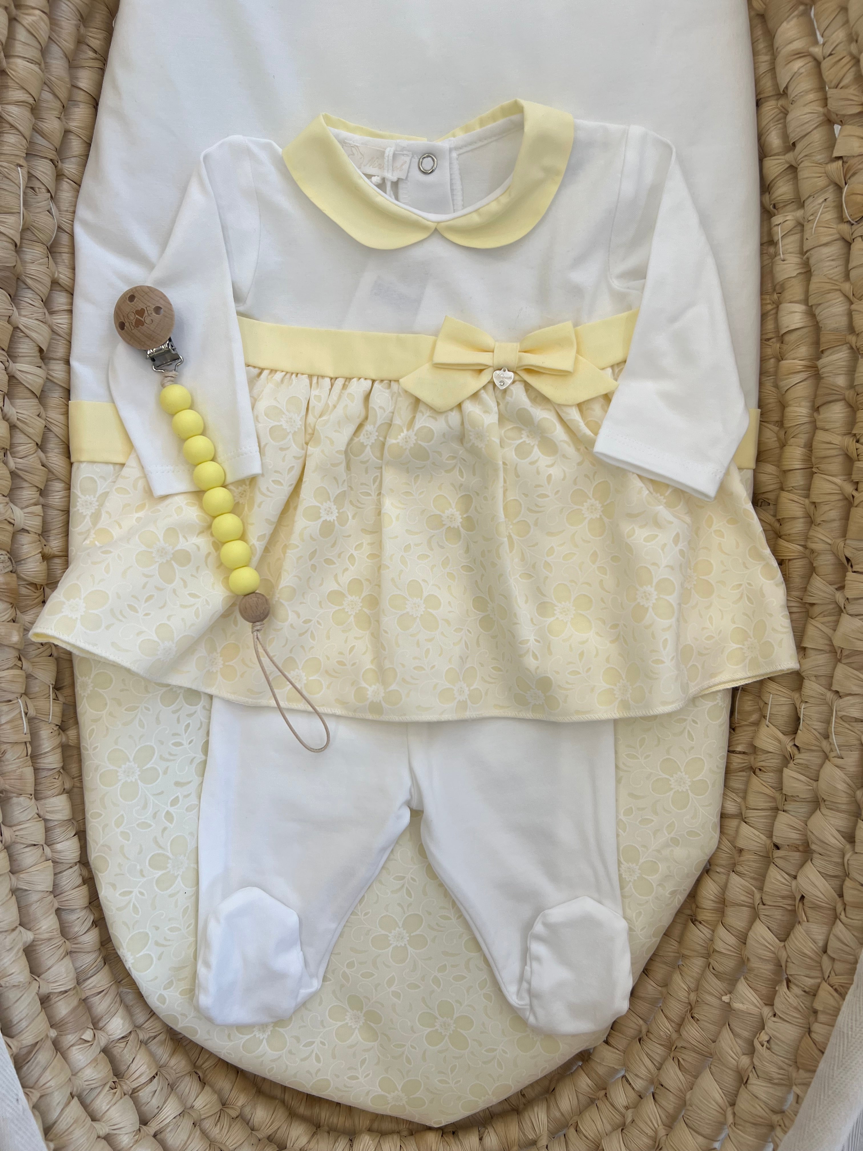 Completo nascita firmato Ninnaoh cod E25C30in morbido jersey di cotone, ideale per i mesi da aprile a ottobre. Rifinito con cura in ogni dettaglio nei delicati toni del bianco e giallo tenue, è perfetto per accogliere la tua neonata con stile e comfort. Qualità garantita Made in Italy.