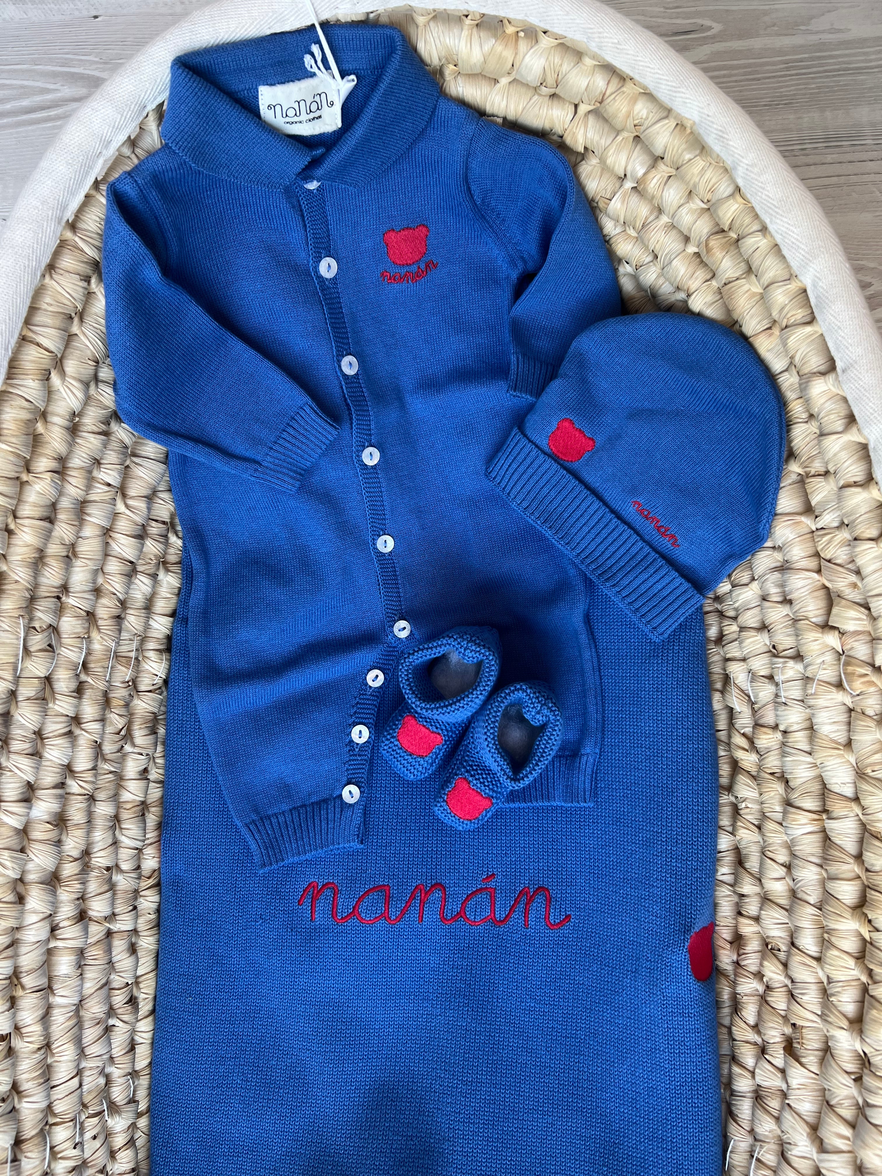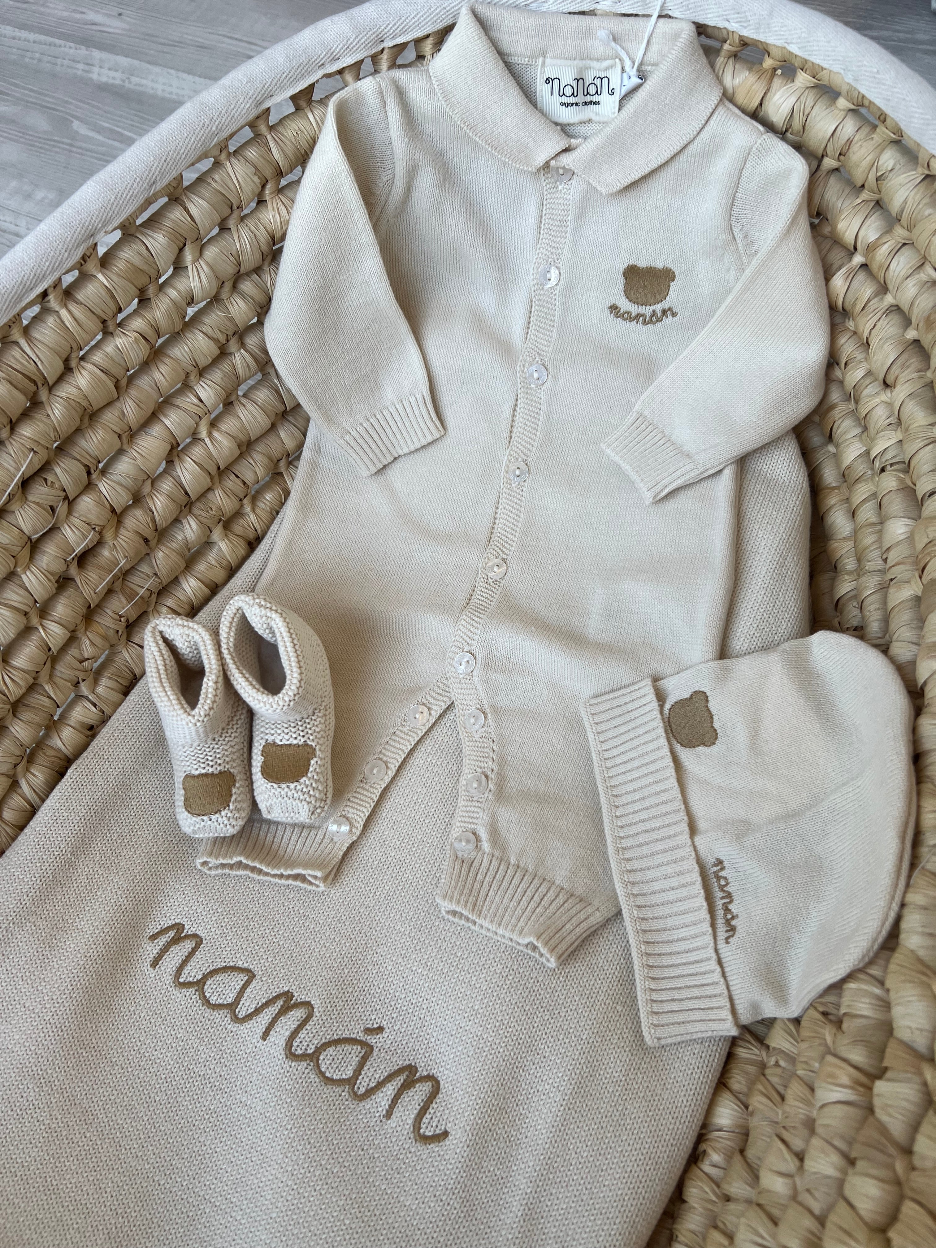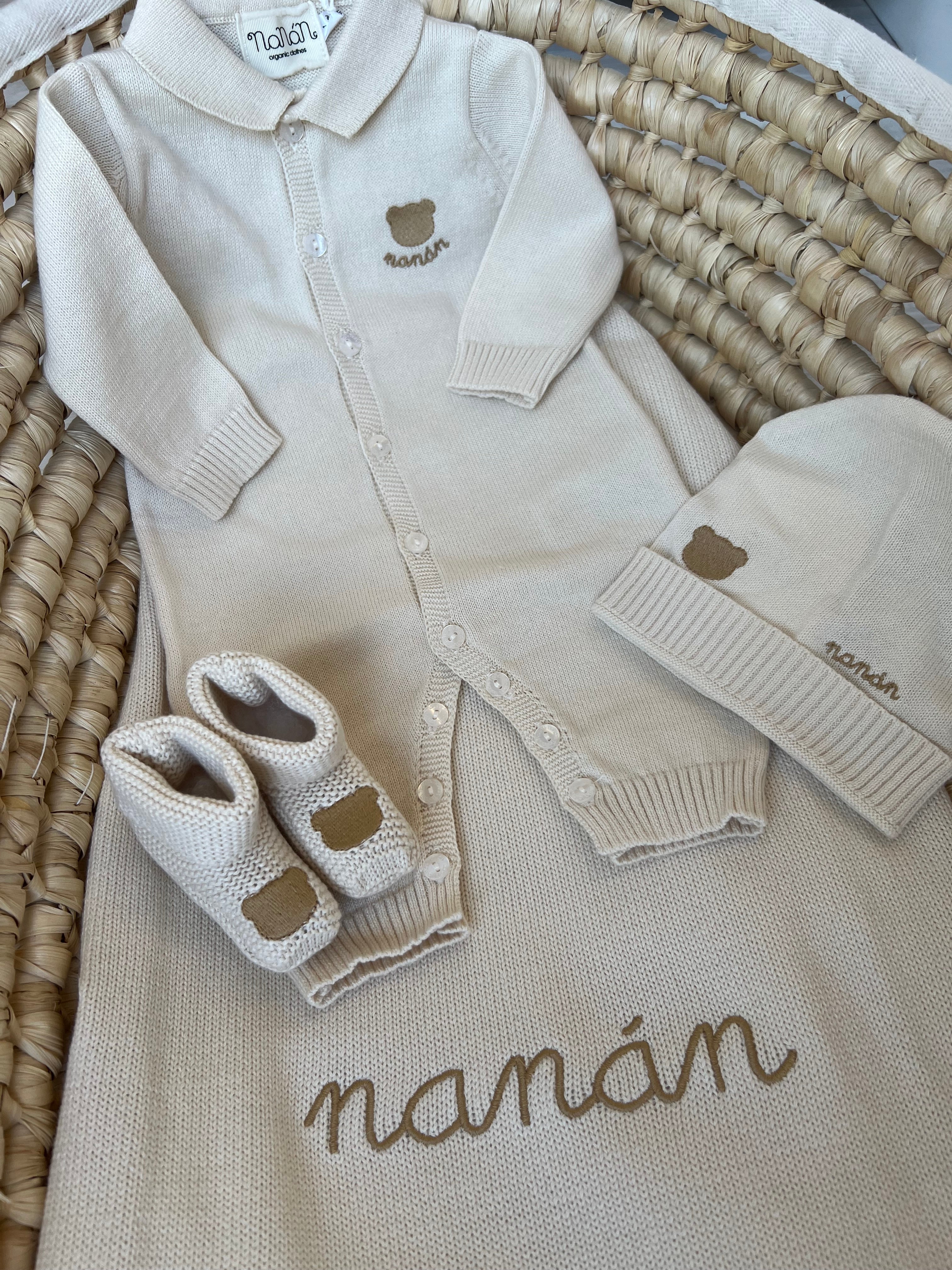 Raffinato coordinato nascita firmato Nanán, composto da tutina, cappellino, scarpine e copertina in tricot. Realizzato in delicato filo di cotone color panna, è impreziosito dal ricamo orsetto e logo ton sur ton. Perfetto per accogliere il tuo neonato con eleganza, morbidezza e comfort.