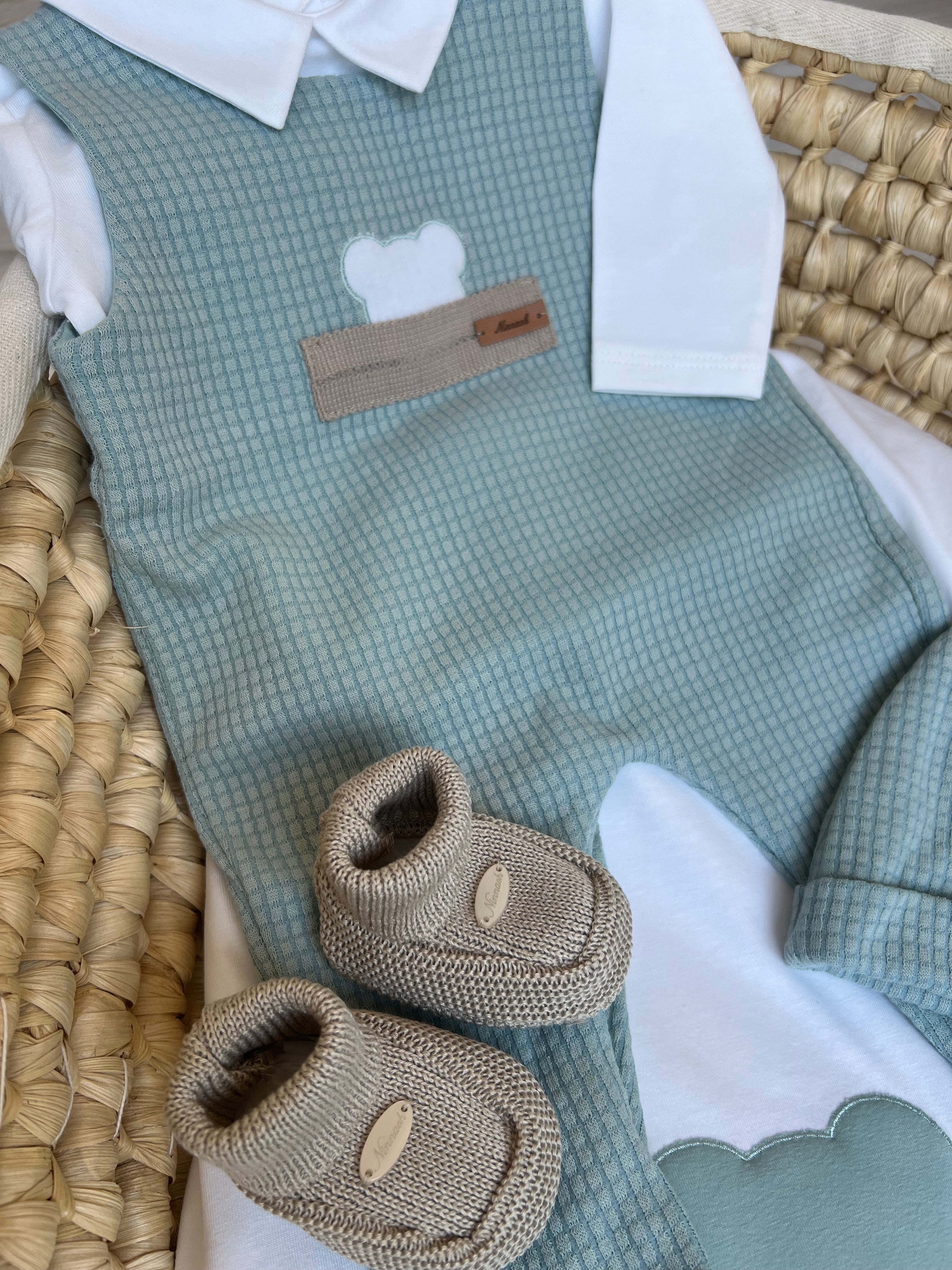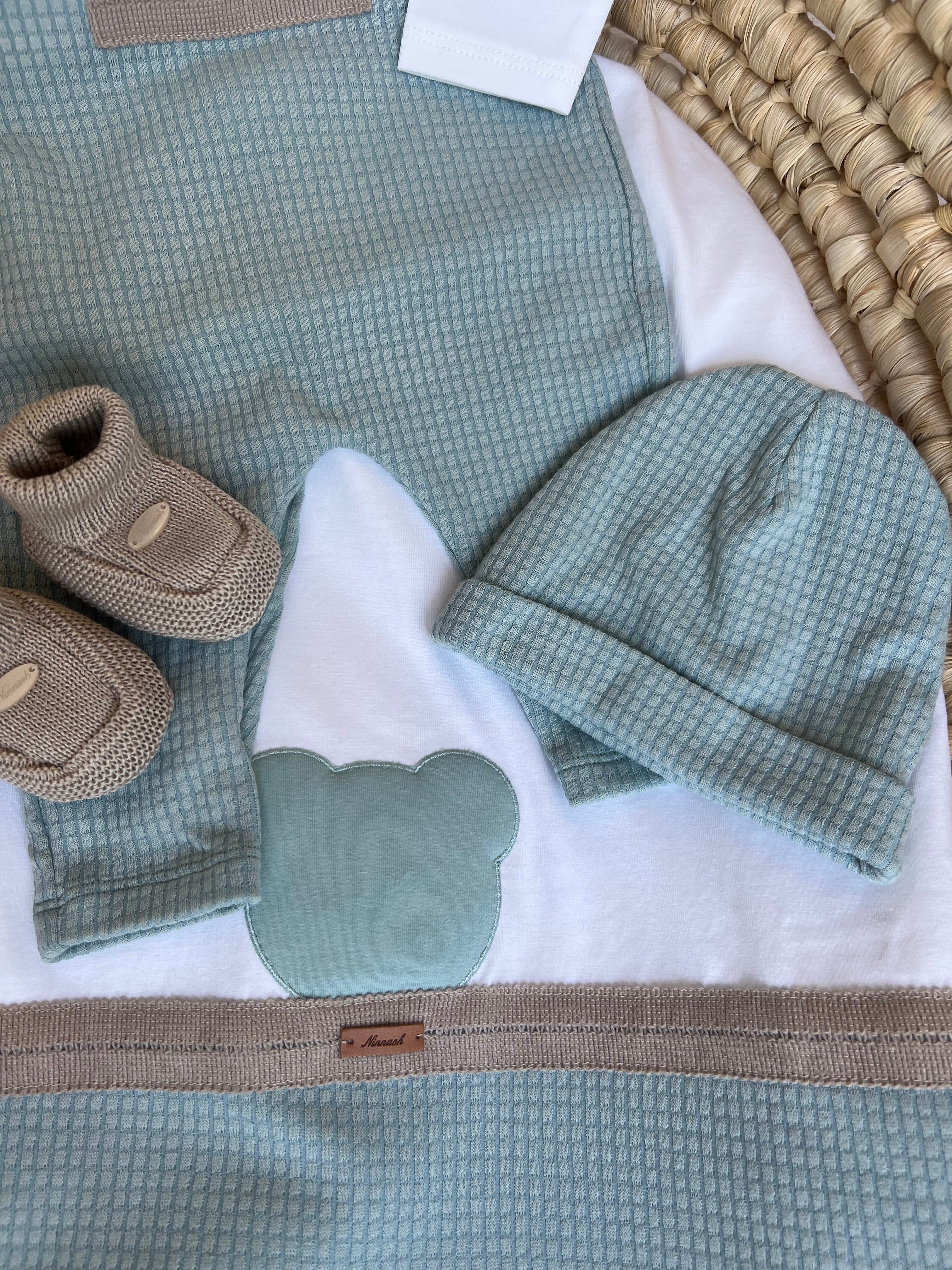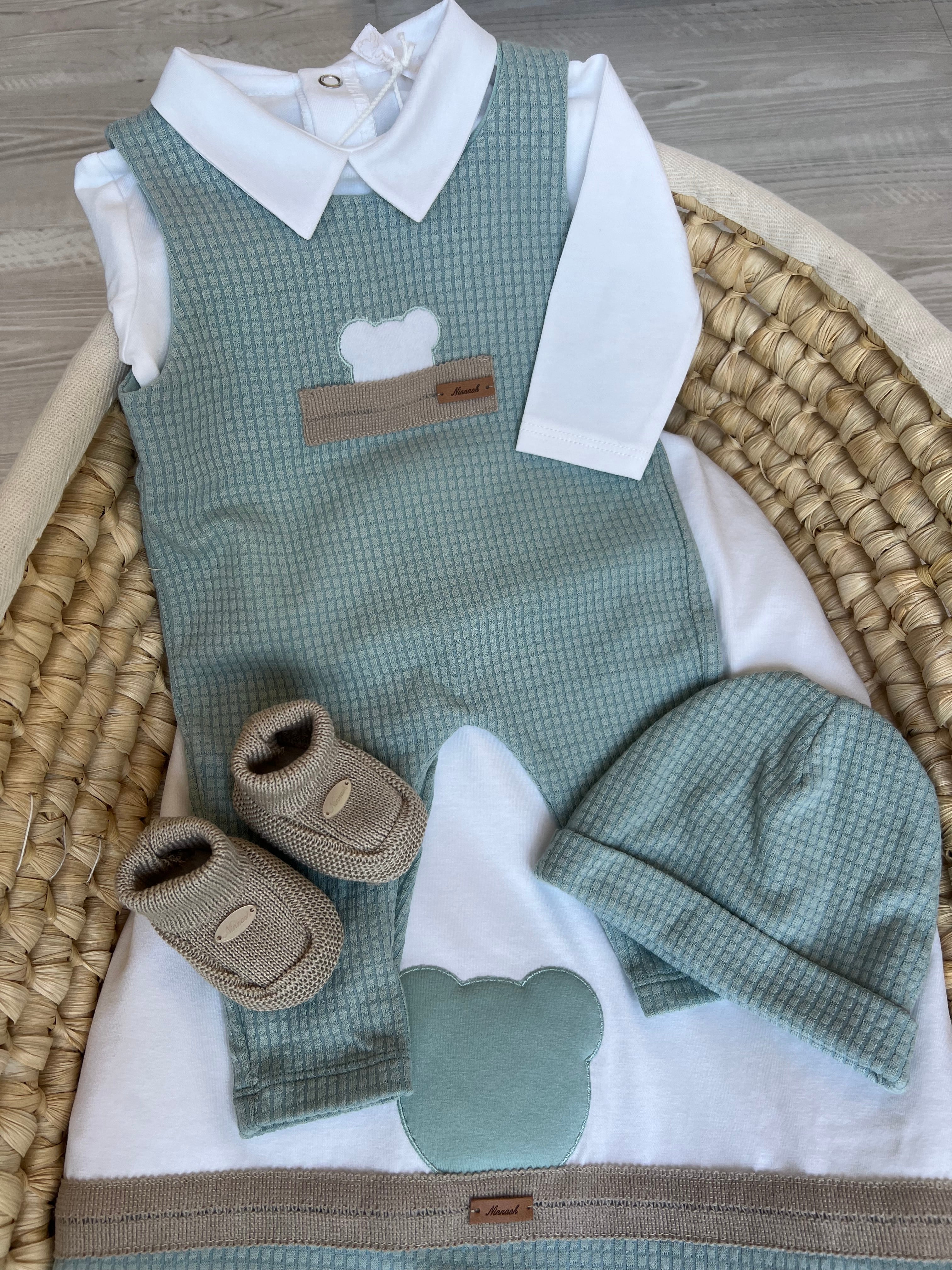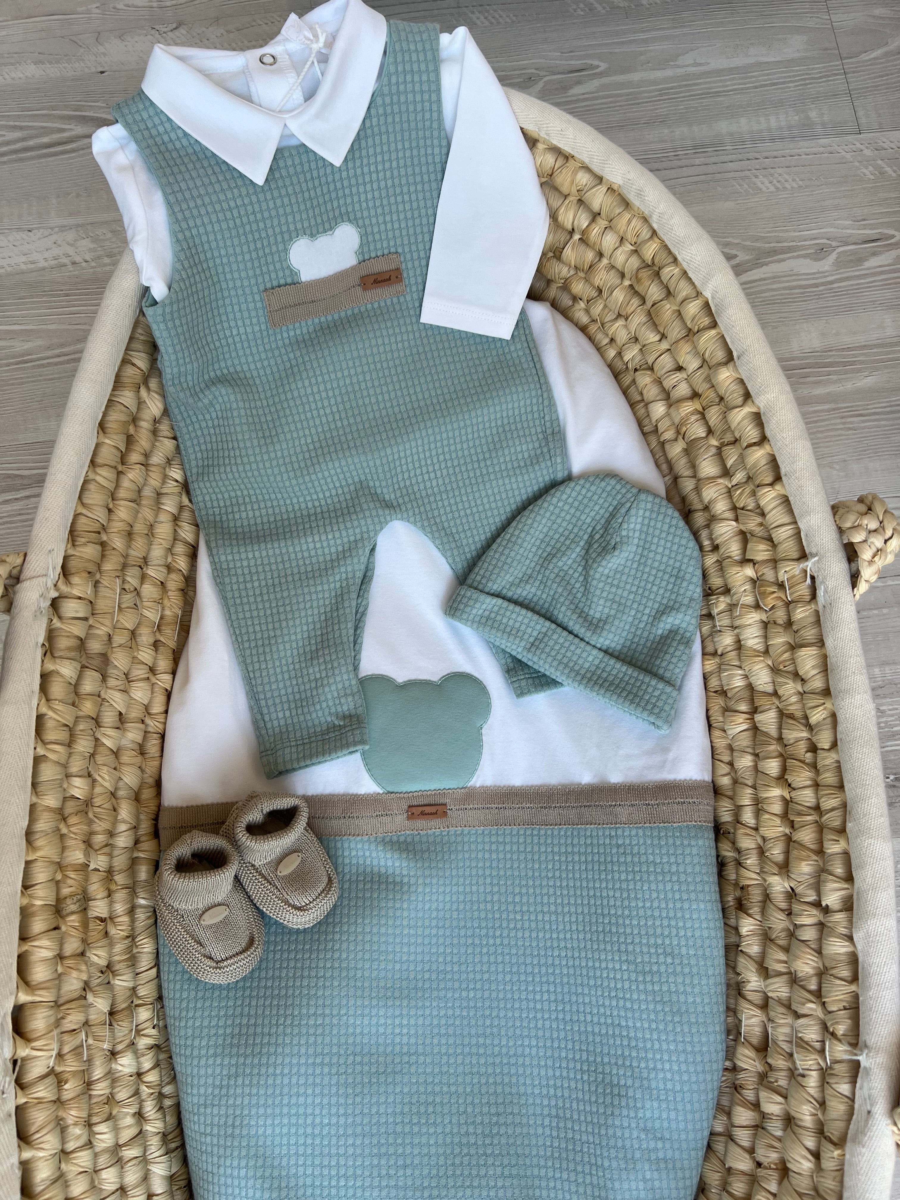 Coordinato nascita firmato Ninnaoh, composto da tutina con colletto, cappellino, coperta imbottita e scarpine abbinate. Realizzato in morbido cotone lavorato a nido d’ape nei delicati toni del verde salvia e beige. Il dolce orsetto applicato aggiunge un tocco tenero e raffinato. Ideale per accogliere il tuo piccolo con comfort e stile. Made in Italy.