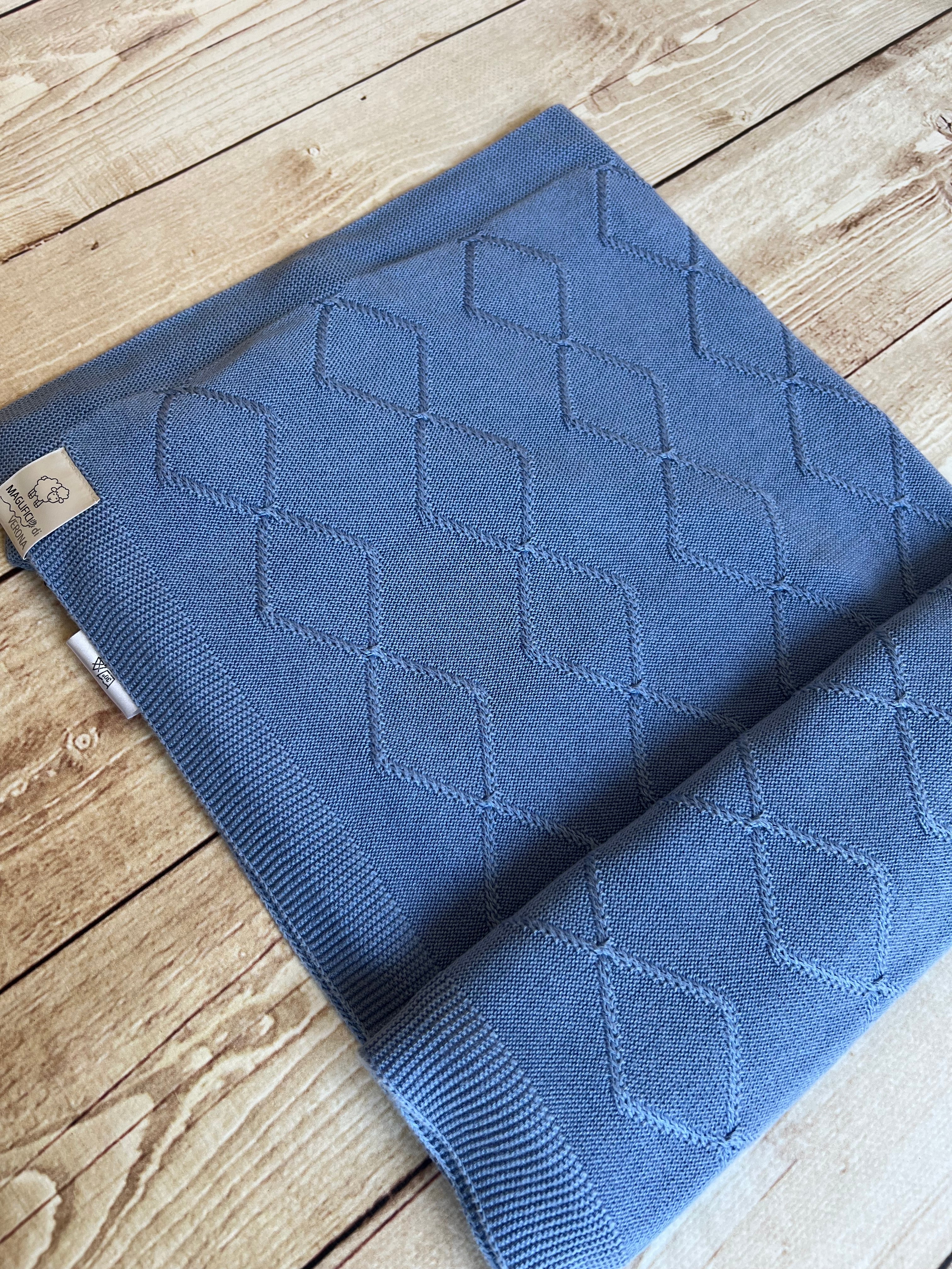 Copertina morbidissima firmata Maglificio di Verona cod 045378, realizzata in 100% filo di eucalipto, una fibra naturale, traspirante e delicata sulla pelle del neonato. Nella raffinata tonalità blu avio, è perfetta per avvolgere il tuo piccolo in un abbraccio di comfort e dolcezza.