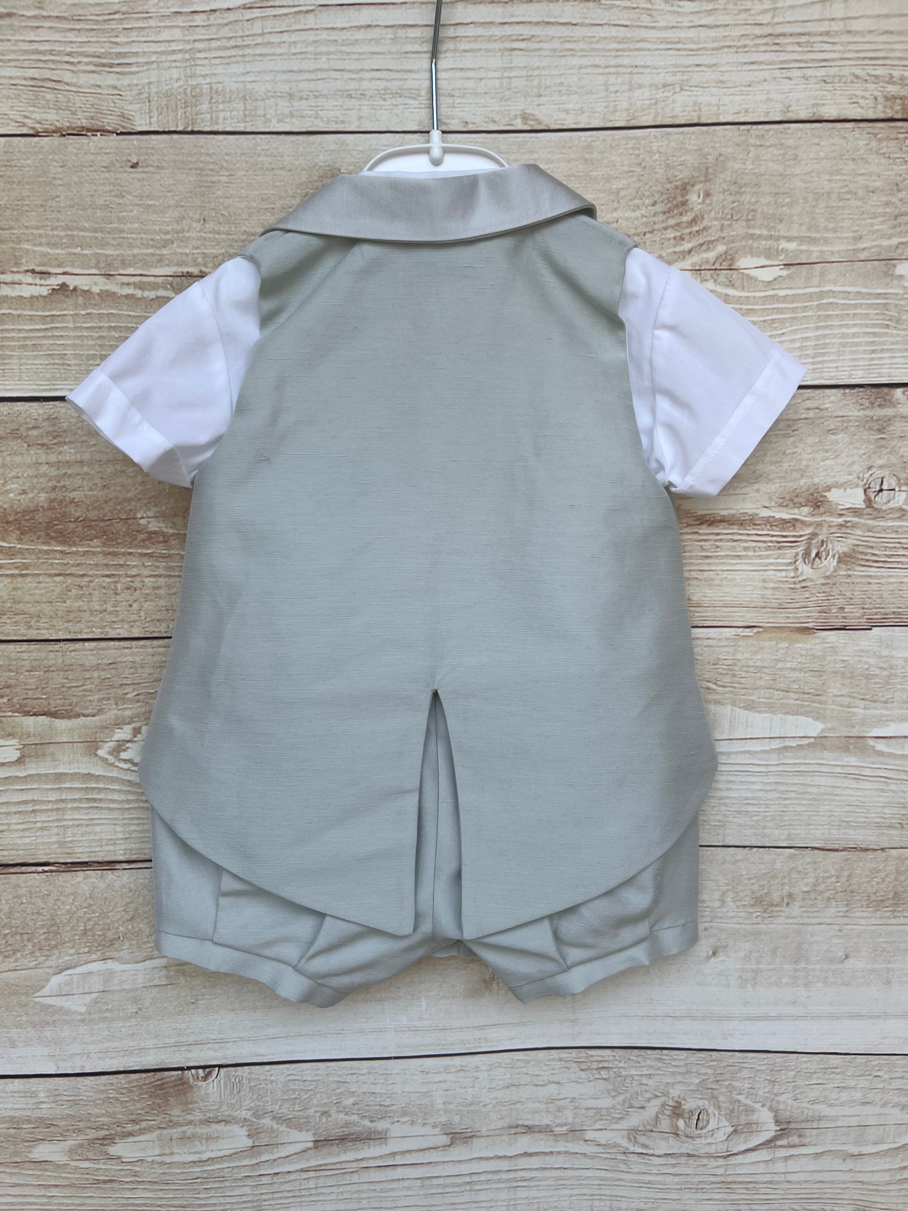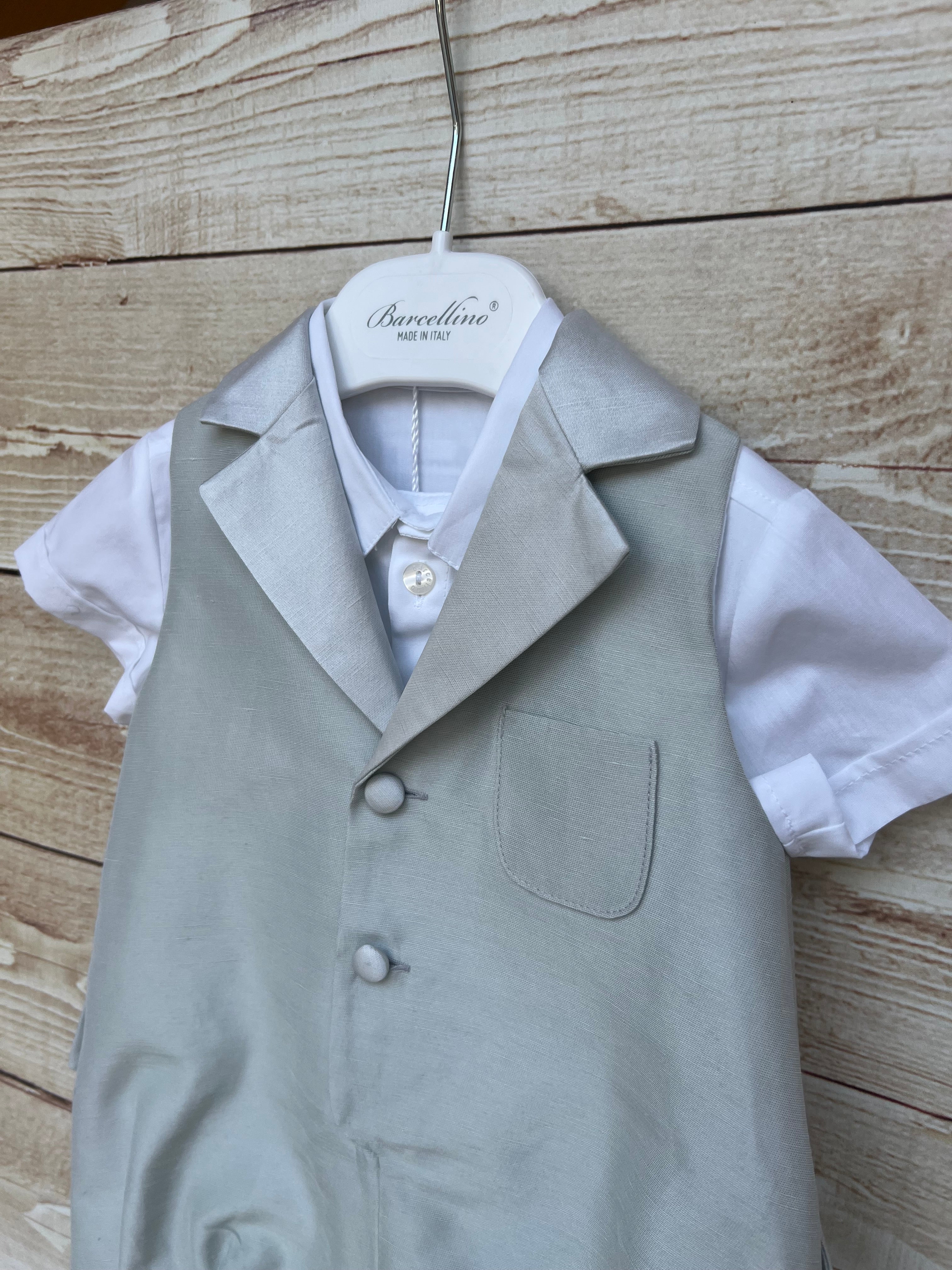 Pagliaccetto effetto completo con gilet integrato, colletto a rever e bottoncini rivestiti tono su tono. La camicia bianca a maniche corte è cucita, per garantire massima praticità senza rinunciare all’eleganza. Il retro presenta un taglio a coda che richiama le giacche formali, rendendo questo capo perfetto per battesimi, matrimoni o eventi speciali.