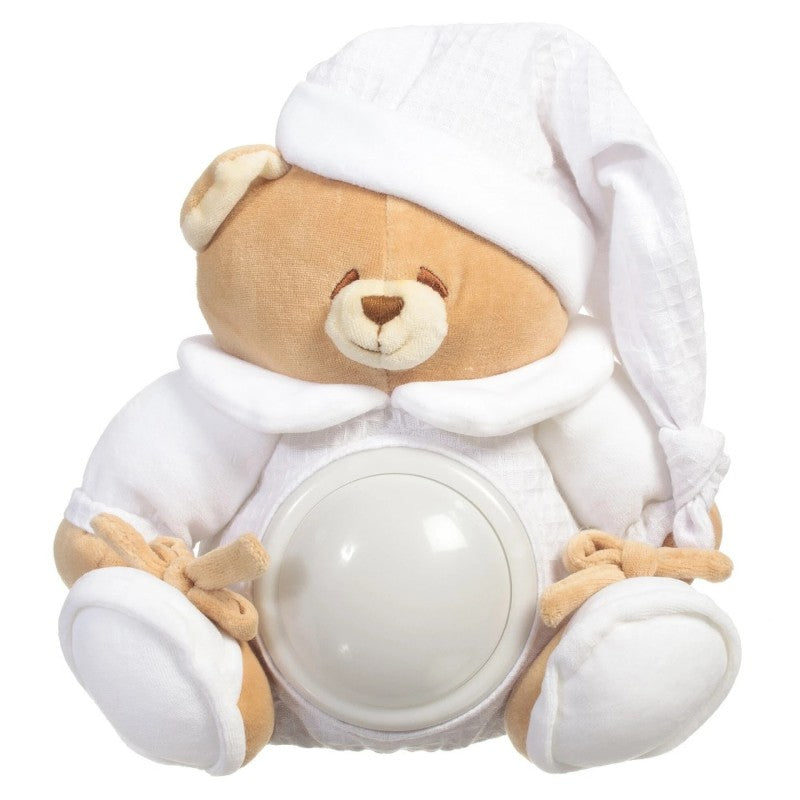 Tato che si illumina è un dolcissimo peluche a forma di orsetto, completamente rivestito in puro cotone al 100%. Sulla pancia si trova un interruttore rotondo, una volta toccato, emana una luce tenue. Indispensabile per il bambino prima e durante il momento della nanna, per farlo sentire protetto e al sicuro in compagnia del suo piccolo amico. La luce non riscalda il peluche, così il bebè può dormire abbracciato al suo orsetto illuminato. Tato è un tenero compagno del tuo bambino e lo accompagna in ogni momento del giorno e della notte! Dimensioni: 25cm