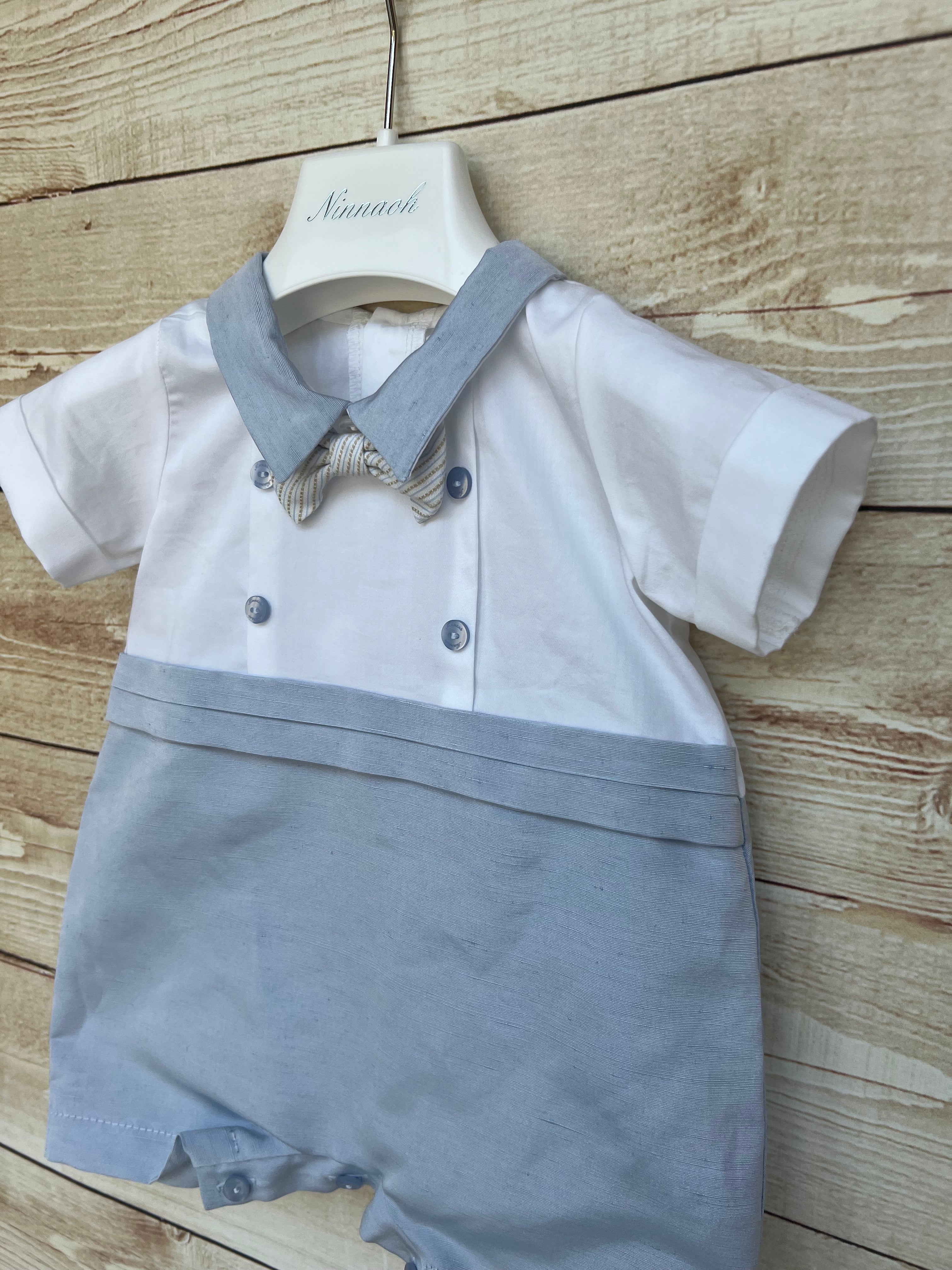 Pagliaccetto elegante firmato Ninnaoh cod E25P250 realizzata in leggero cotone con parte superiore bianca e colletto a contrasto celeste doppia fila di bottoncini decorativi e papillon in coordinato pantaloncino azzurro con bottoncini sul fondo per un cambio pratico e veloce ideale per cerimonie e momenti speciali con un tocco di classe e comodità Made in Italy