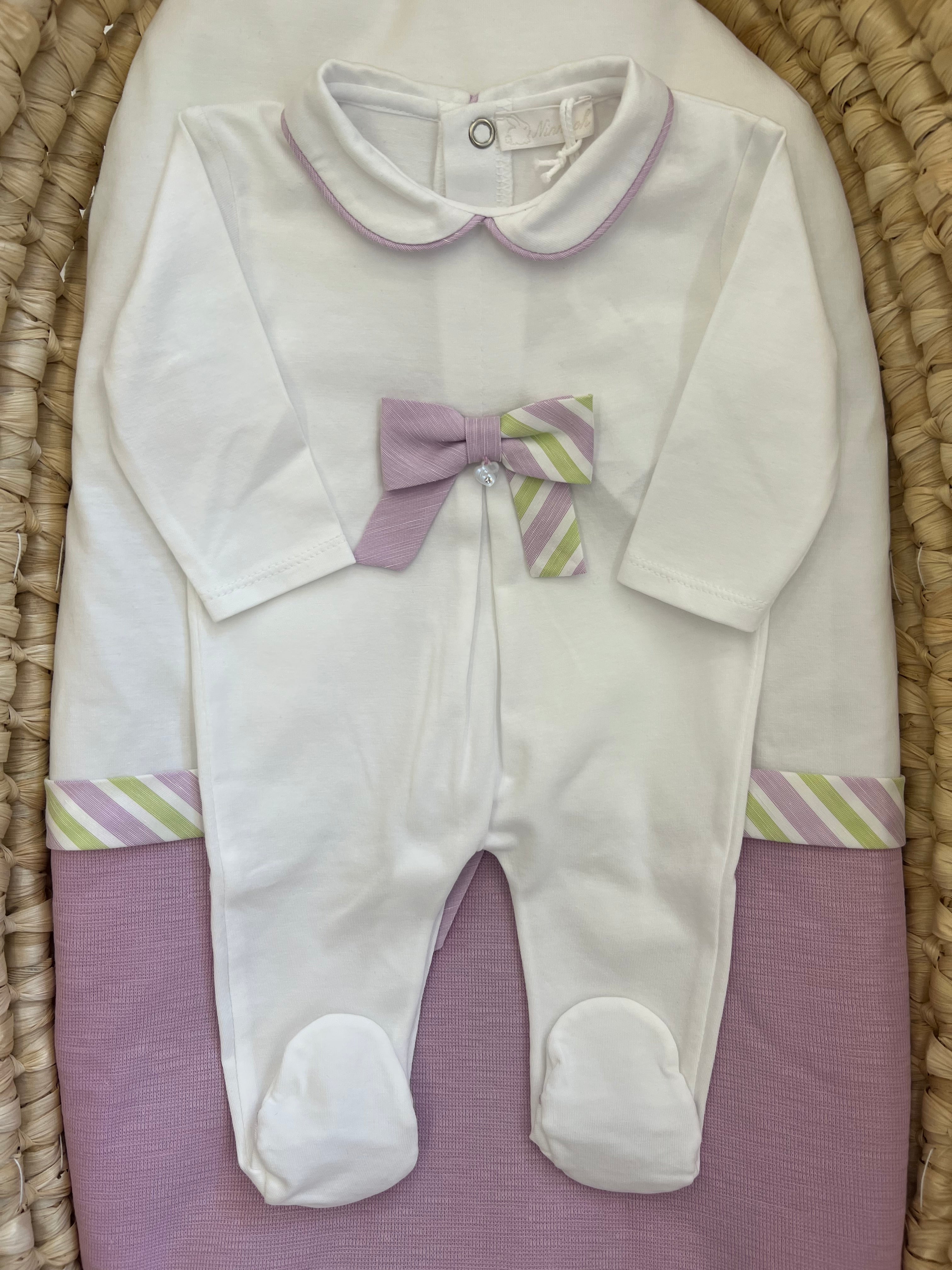 Tutina nascita firmata Ninnaoh cod E25T41 in morbido jersey di cotone, perfetta per i mesi da aprile a ottobre. Nei delicati toni del bianco, impreziosito da un fiocco dalle tonalità del lilla e a righe verde. Un accessorio che unisce comfort, dolcezza e qualità Made in Italy.